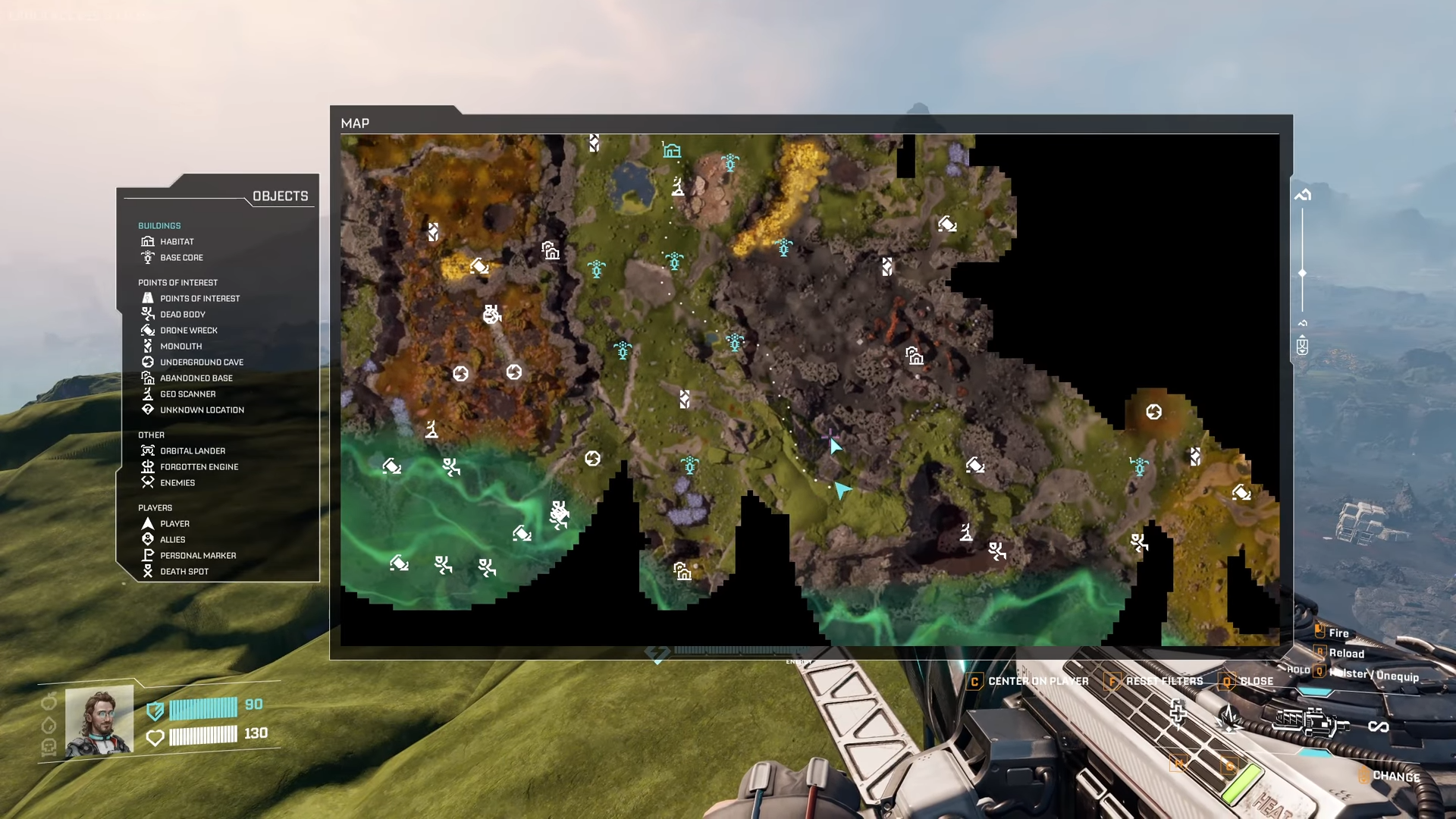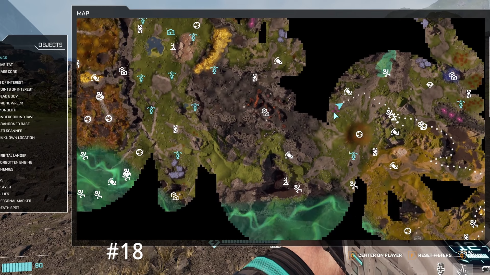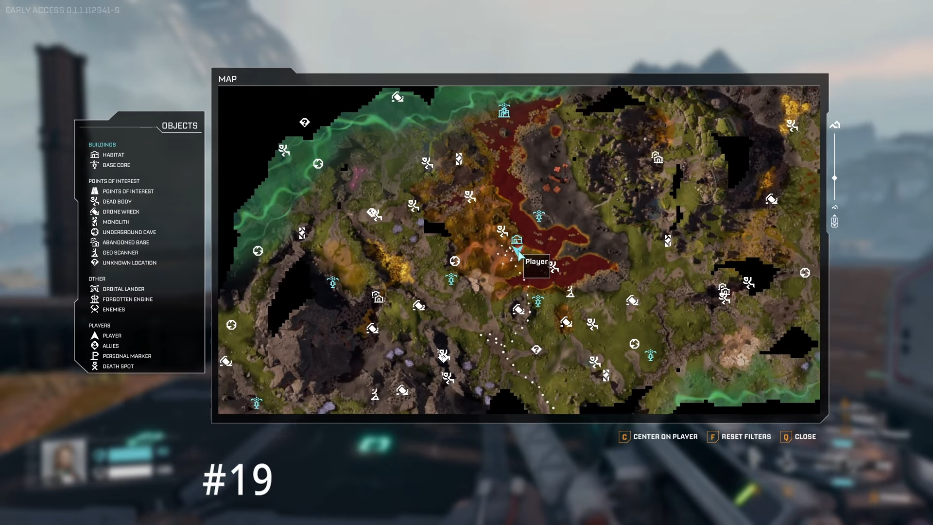 Launch from orbital lander and scanner-scan blue/red lakes for hints. Drone east to engines (spots 1-3), northeast peaks to red lake (19), or west for plateaus.