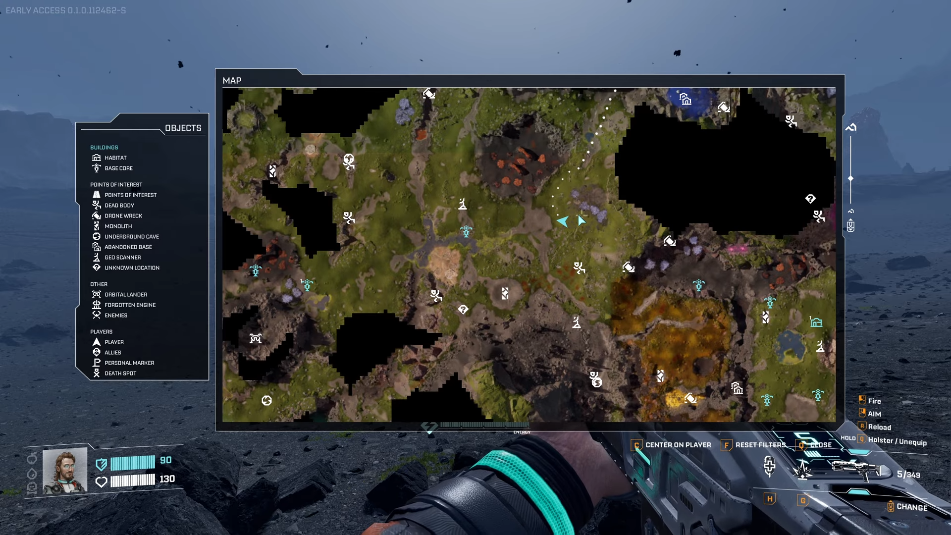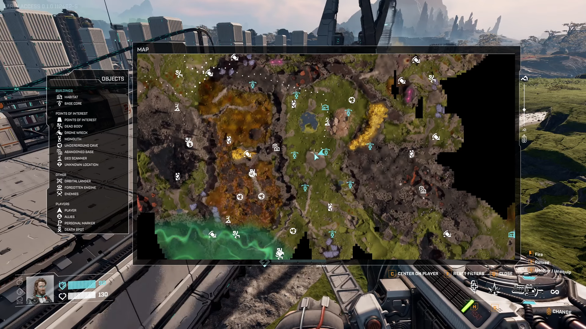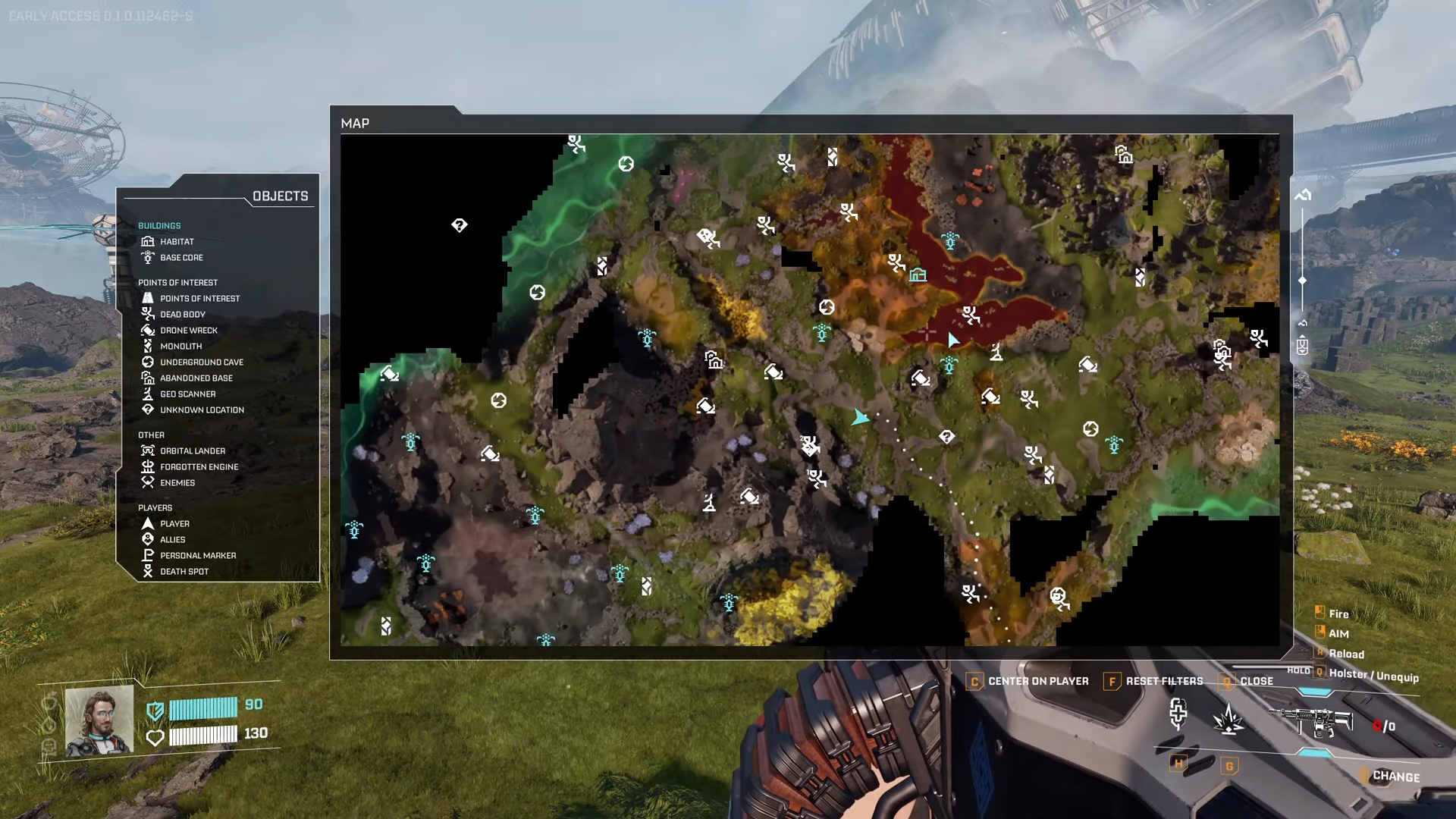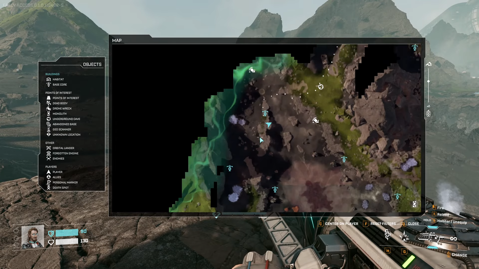 Launch from orbital lander and scanner-scan blue/red lakes for hints. Drone east to engines (spots 1-3), northeast peaks to red lake (19), or west for plateaus.