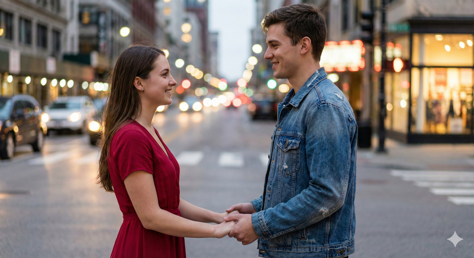 1. Ultra-realistic portrait of a couple holding hands, city lights blurred background. Girl in red dress, boy in denim jacket, both smiling softly and looking at each other. Maintain original faces for authenticity.