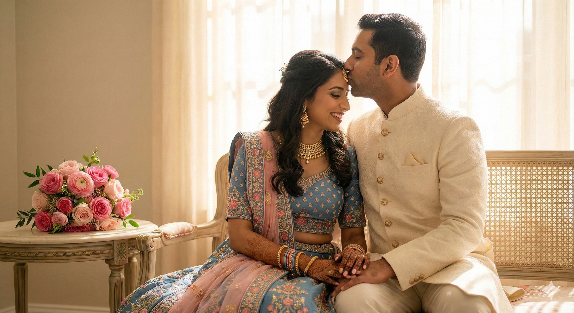 10. Ultra-realistic 8K portrait: man kissing woman’s forehead, she smiles. Woman in blue-pink embroidered Indian attire with mehndi and jewelry, man in matching sherwani. Pink bouquet nearby, cinematic soft lighting.