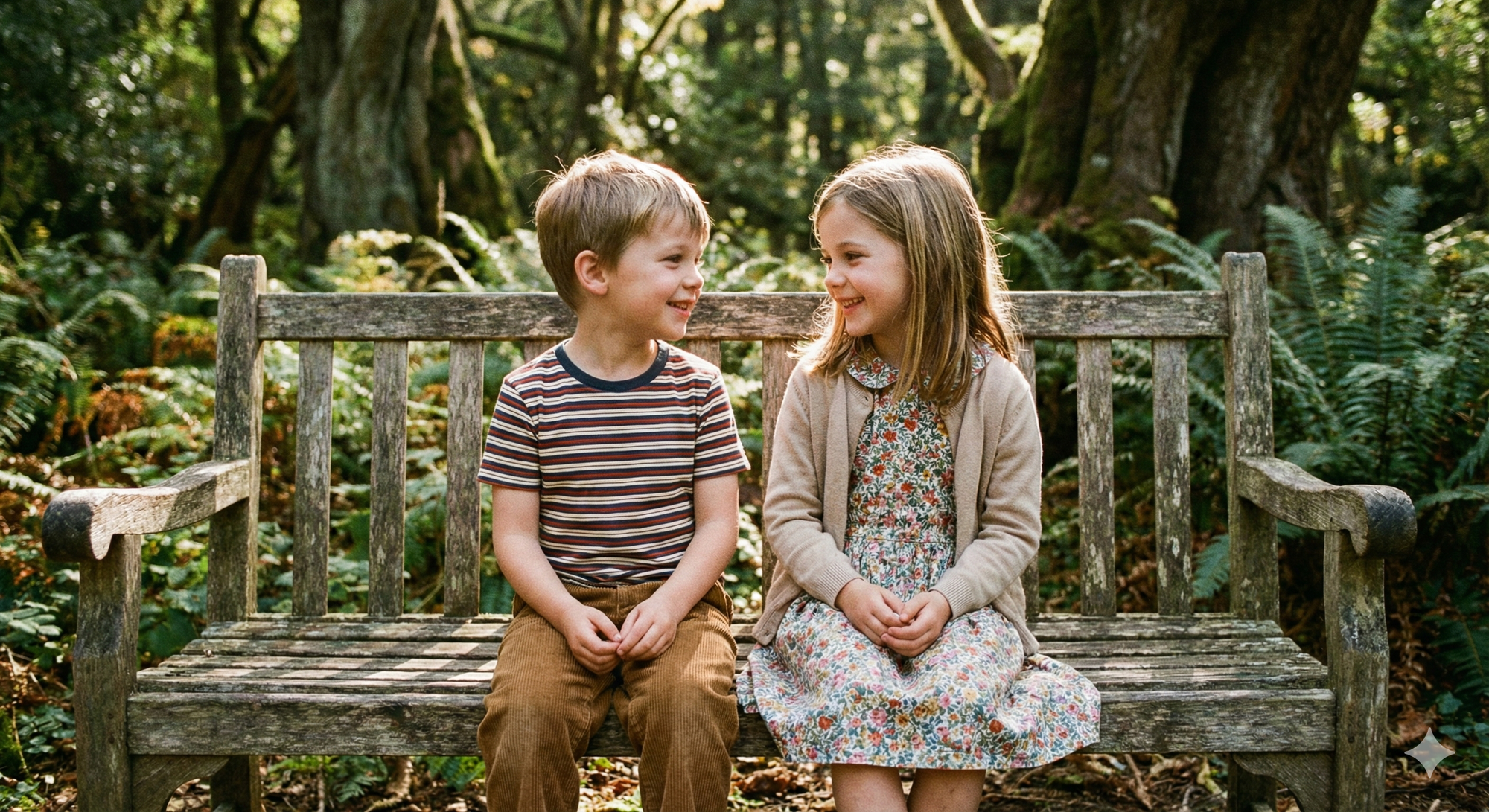 11. Boy and girl sitting on vintage bench outdoors, sunlit, natural expressions, soft-focus forest background.