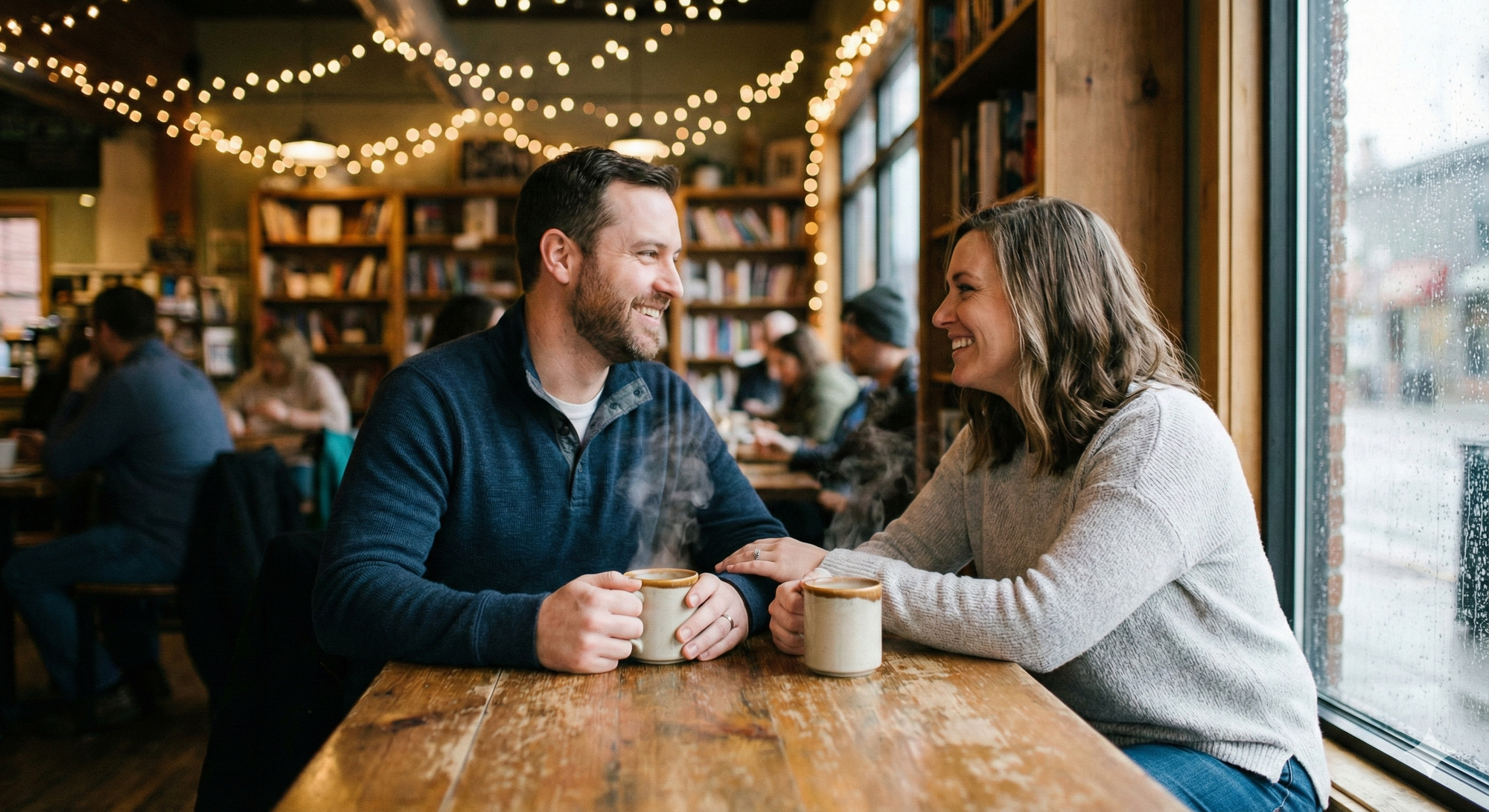 12. Couple sharing coffee at a cozy café table, steaming cups, warm smiles, soft bokeh background.