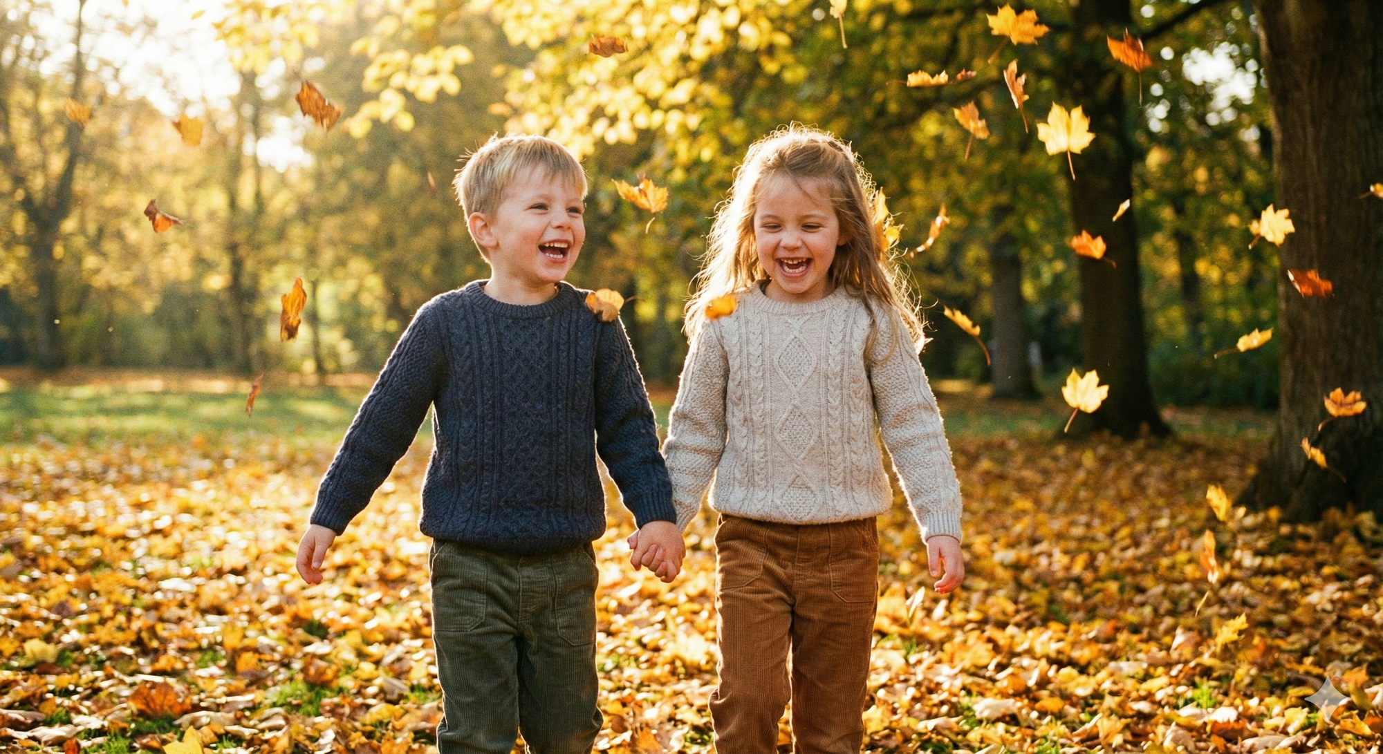 13. Boy and girl walking in colorful autumn park, golden leaves falling, joyful expressions, natural light.