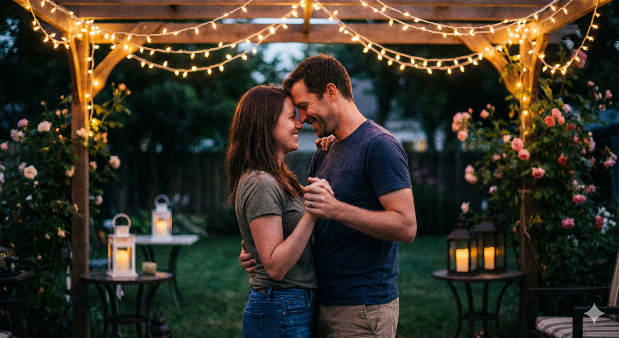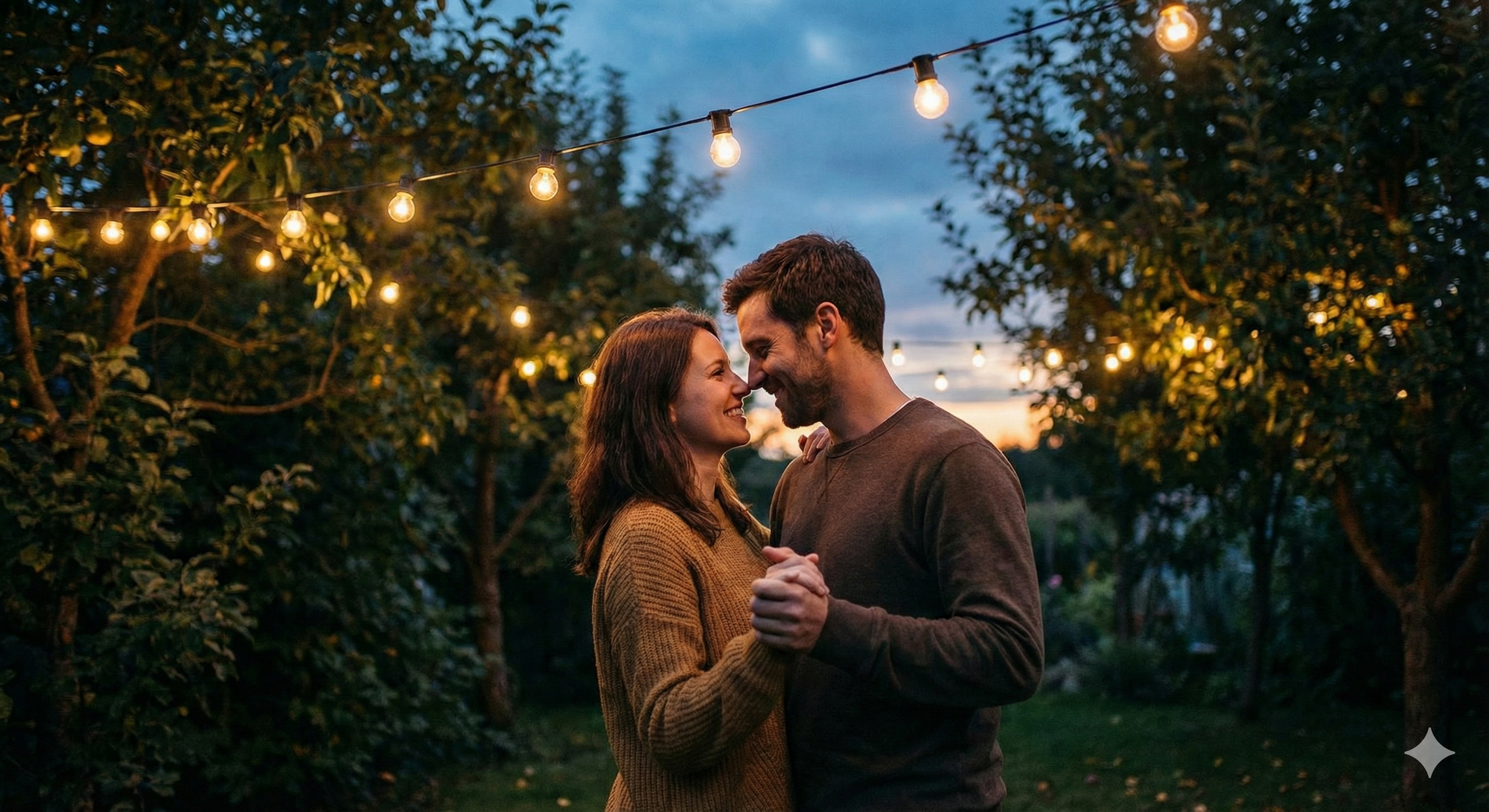 4. Couple dancing slowly under fairy lights strung across an open garden at dusk, smiling playfully with tender closeness visible.