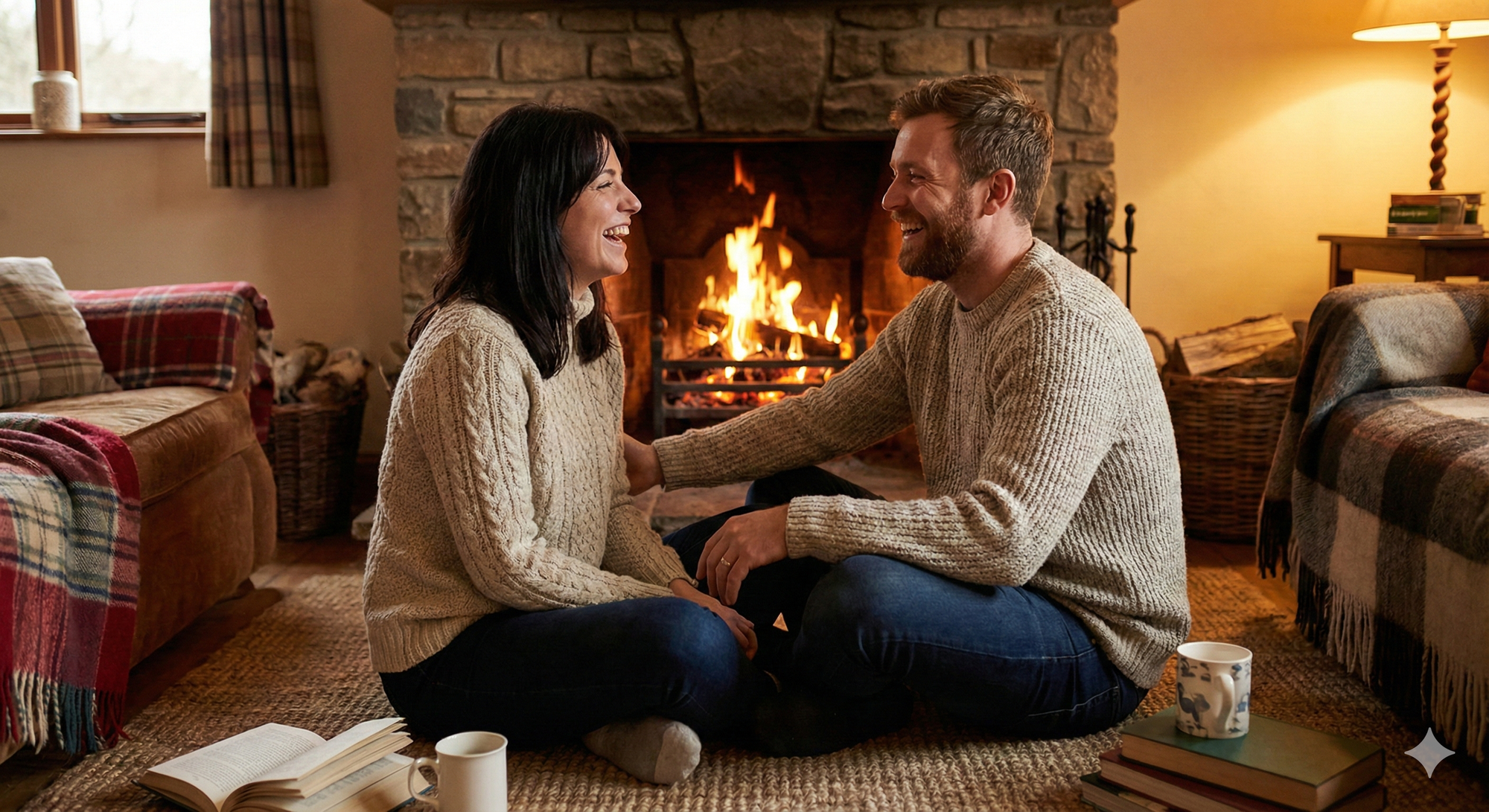 15. Couple sitting by fireplace, cozy sweaters, warm hearth light, intimate laughter.