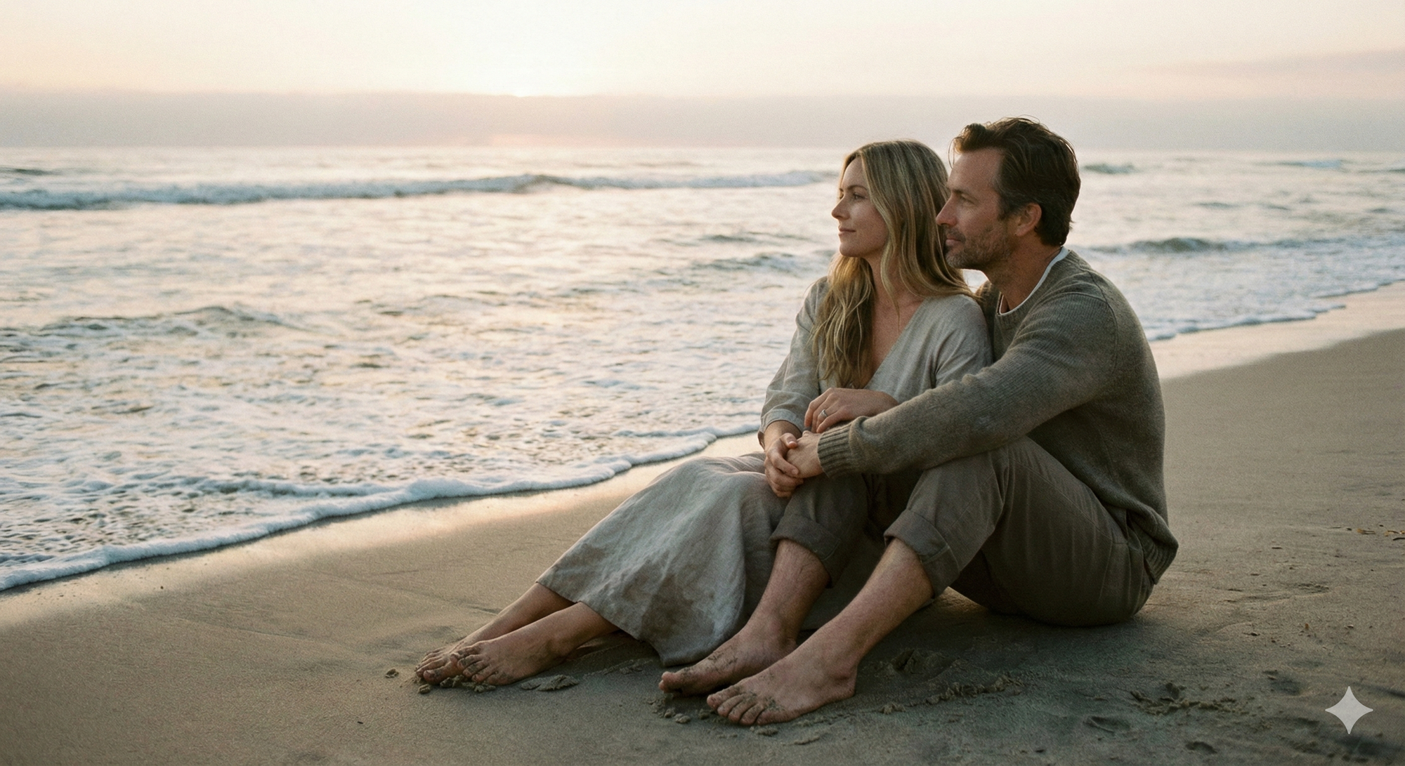 16. Couple on beach at dusk, sand between toes, soft waves, golden hour light, quiet connection.