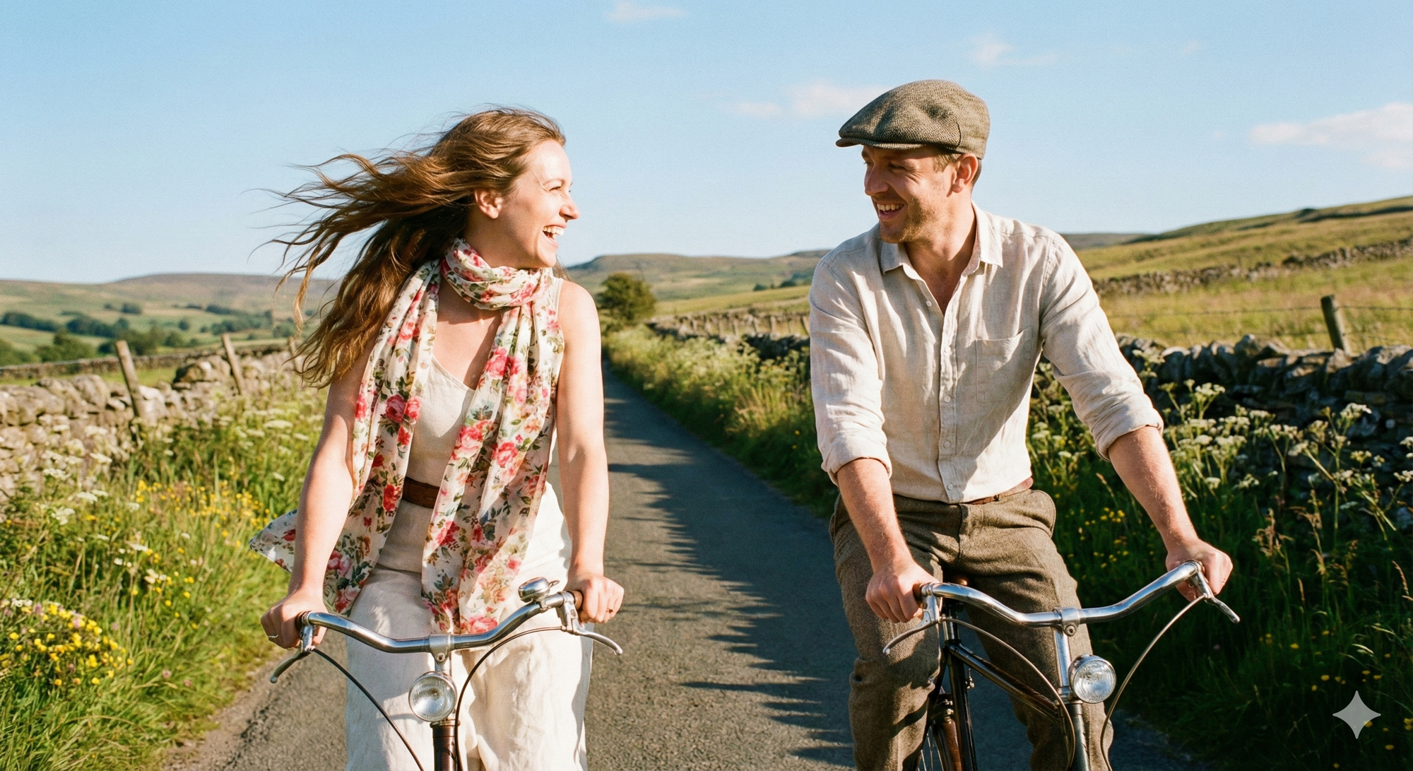 17. Couple biking on countryside road, flowing scarves, wind-blown hair, sunny day, carefree mood.
