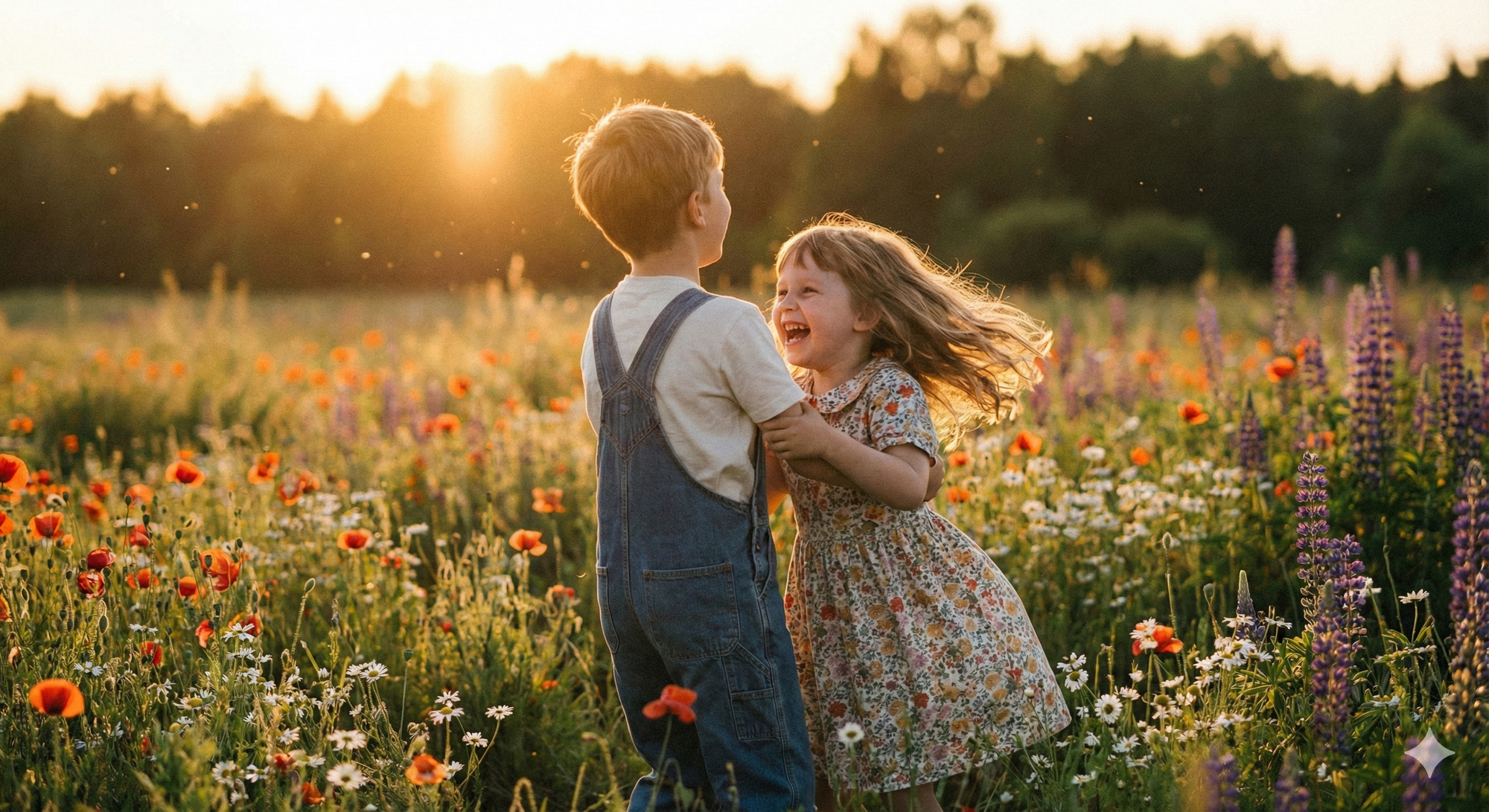 18. Boy twirling girl in field of wildflowers, sunset golden glow, joyous smiles.