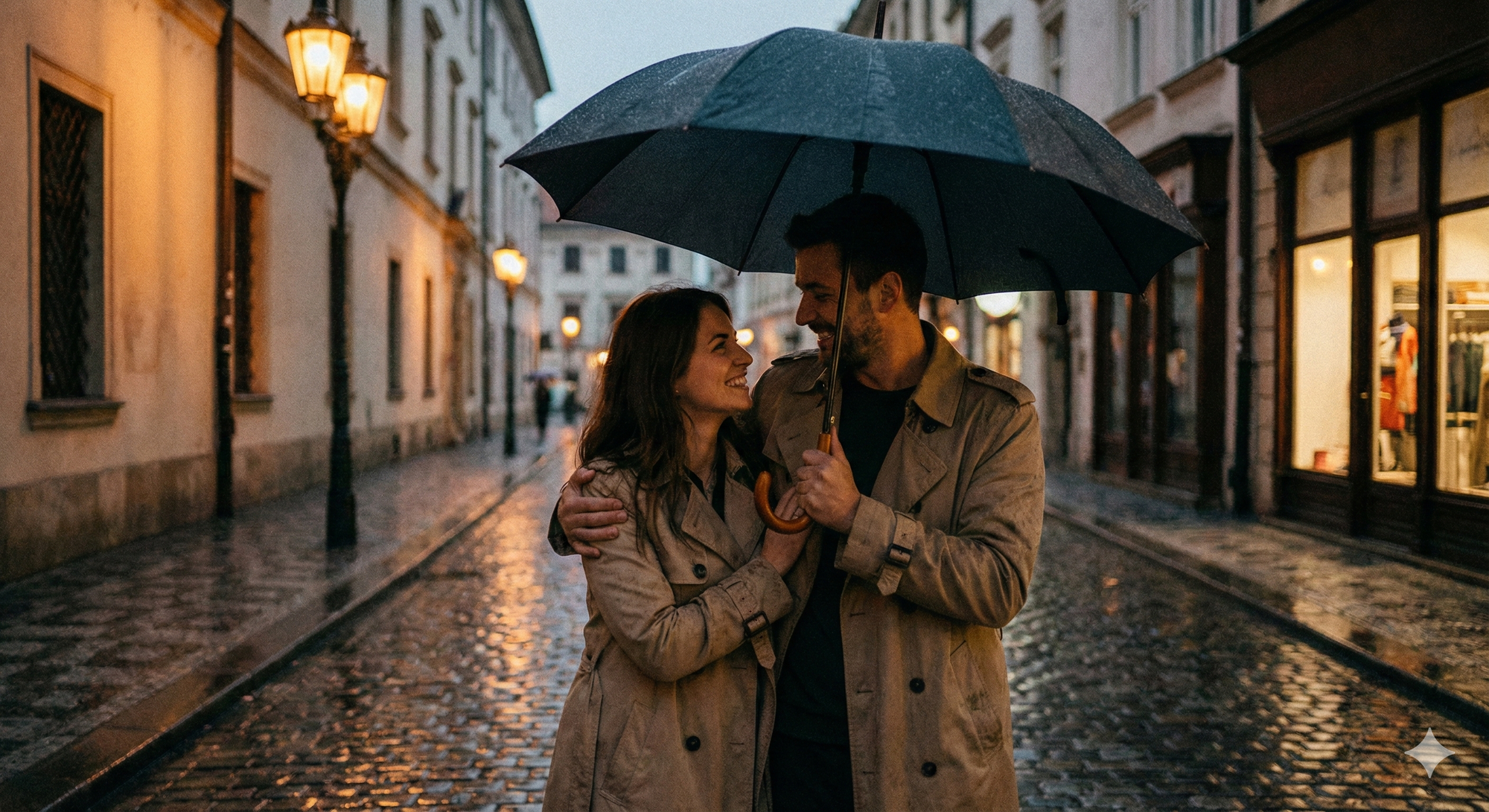 19. Couple sharing umbrella in a gentle rain, reflections on wet street, romantic atmosphere.