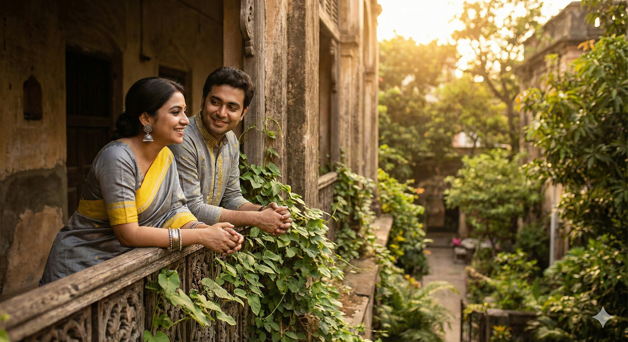 2. An Indian couple sharing a soft, playful smile leaning against a carved wooden railing with green vines. Woman wearing a grey and holud tone saree with elegant silver jewelry; man in coordinated outfit. Rustic romantic backdrop with cinematic lighting.
