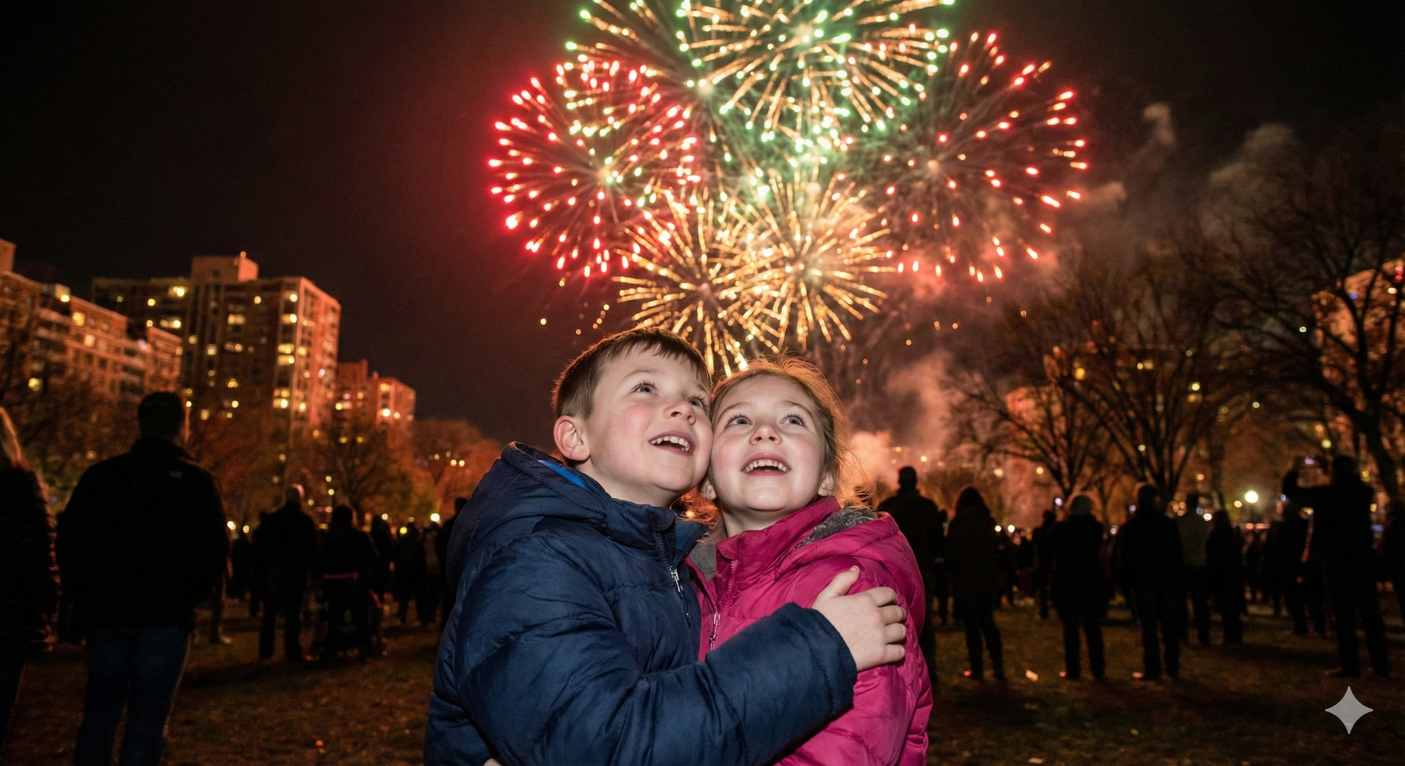 20. Boy and girl watching fireworks, faces lit by colorful bursts, excitement and wonder.