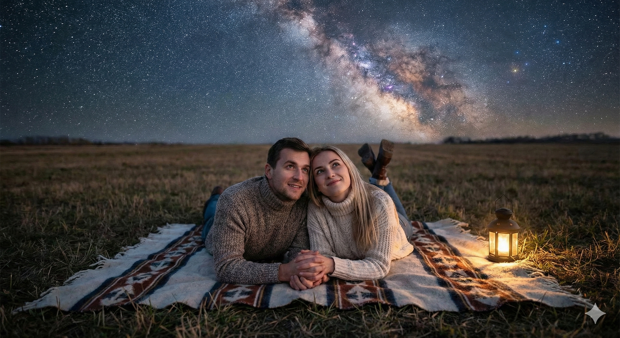 21. Couple lying on blanket under stars, open sky, tender expressions, peaceful scene.