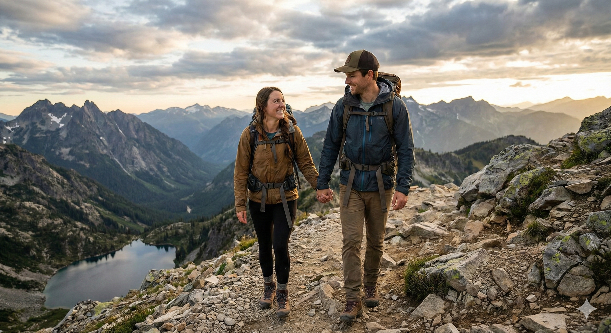 22. Couple hiking mountain trail, panoramic scenic view, holding hands, adventurous spirit.