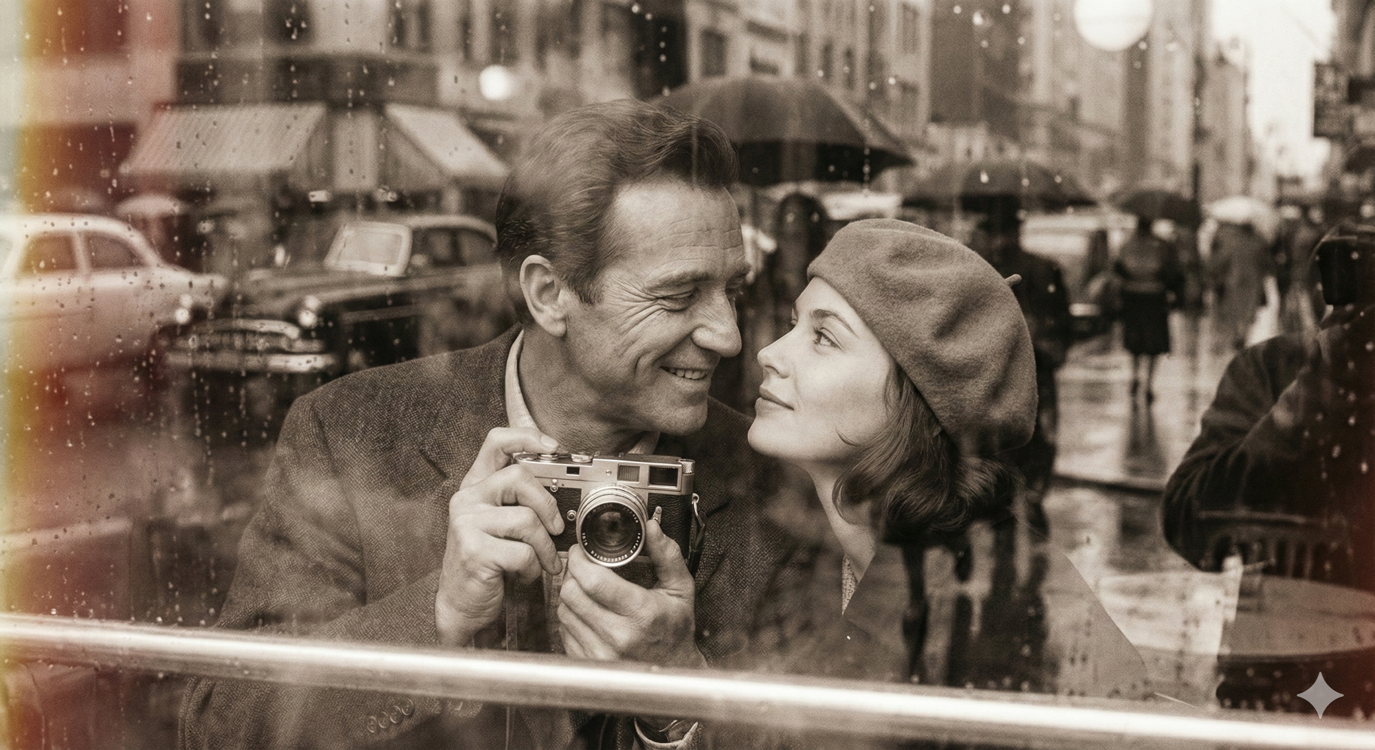 3. A candid moment through a café window where the man holds a vintage film camera smiling warmly, and the woman in a beret looks up softly. Heavy glass reflections, blurred outdoor elements, soft sepia tones, dreamy mood.