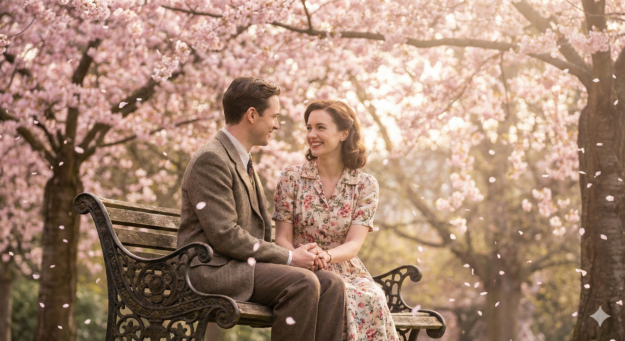 5. Dreamy image of a couple seated on a vintage bench under pink cherry blossoms, soft petals falling, holding hands with warm smiles, ultra-realistic and cinematic.