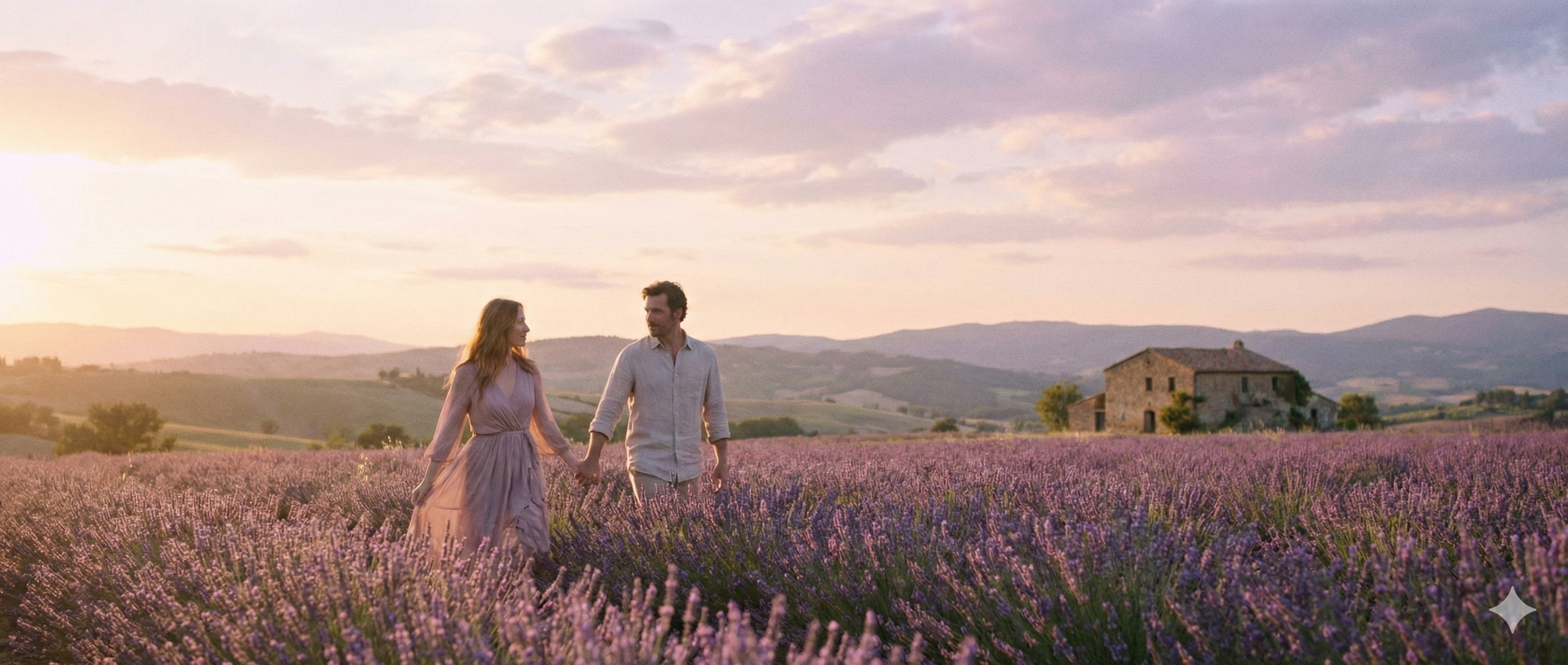 6. Couple walking through a lavender field at sunset, pastel purple tones, cinematic light, ultra-realistic 4K photo.