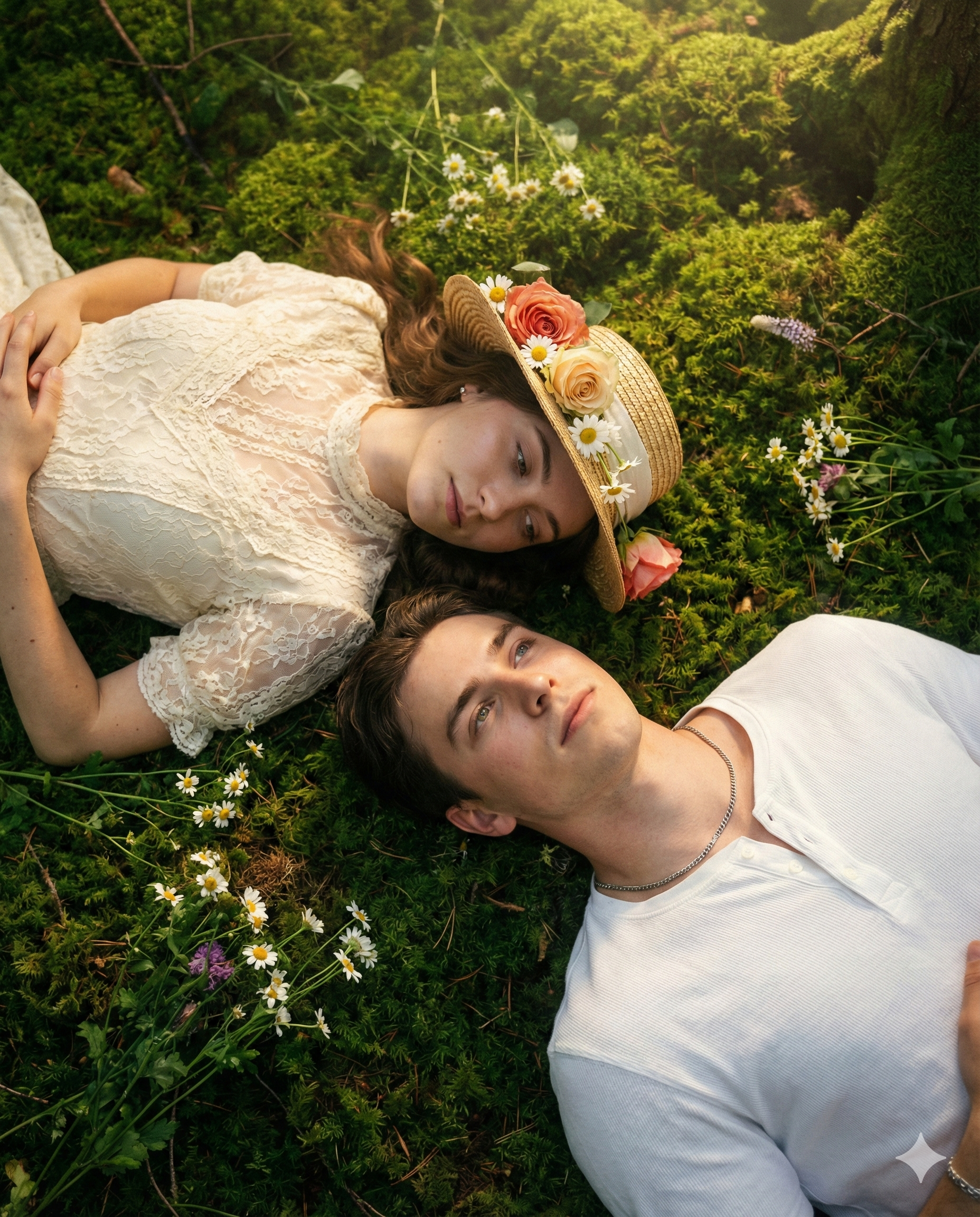 7. High-angle cinematic shot of a young couple lying peacefully on green moss and wildflowers. Woman wears vintage cream dress and straw hat with roses and daisies, man in white Henley shirt and silver chain. Dappled sunlight, dreamy warm glow, hyper-realistic 8K resolution.