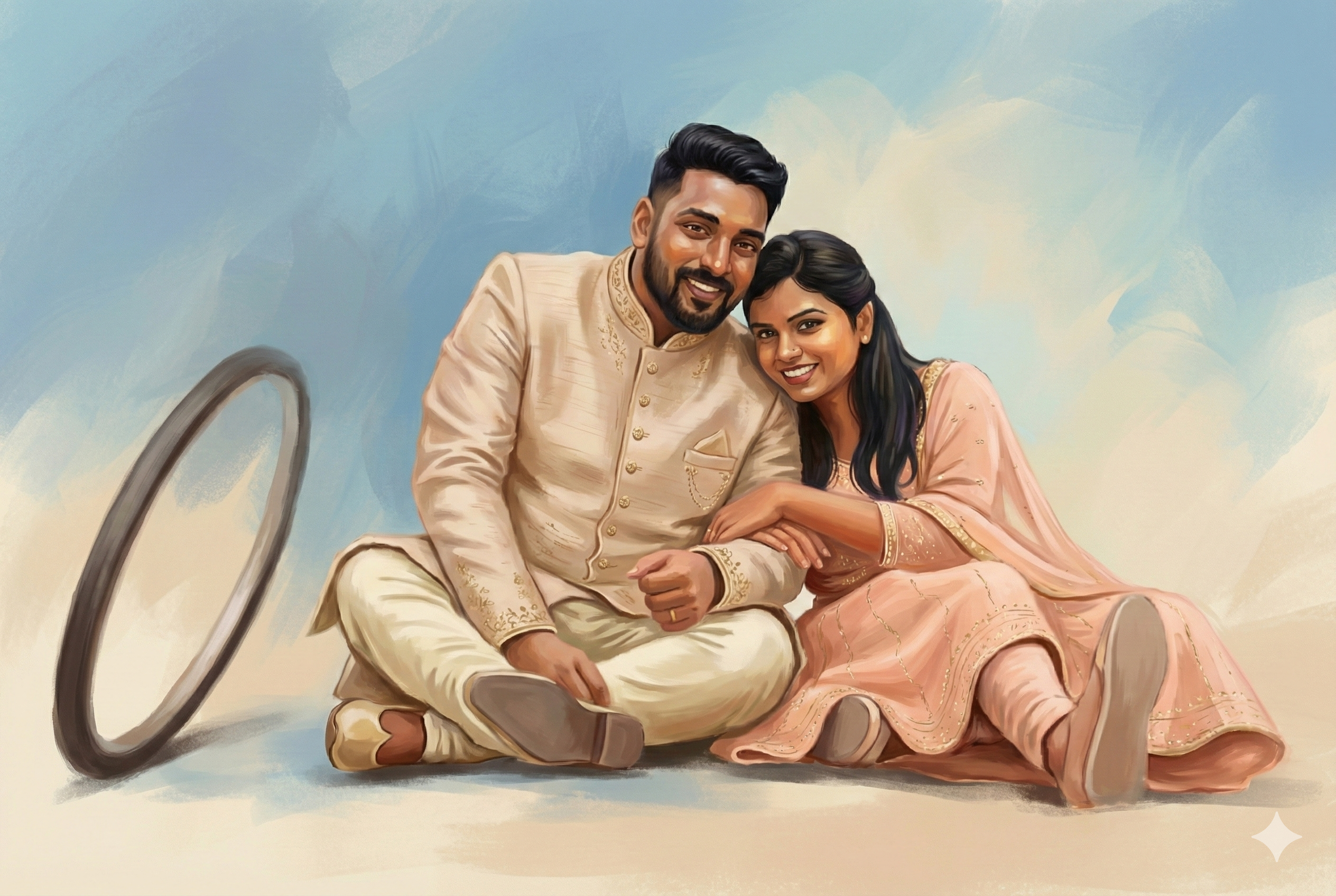 8. Ultra-pro digital painting of couple matching uploaded references exactly in hairstyle and expression. Both wear elegant light Indian style attire with painterly warm skin tones and soft blue/beige background.