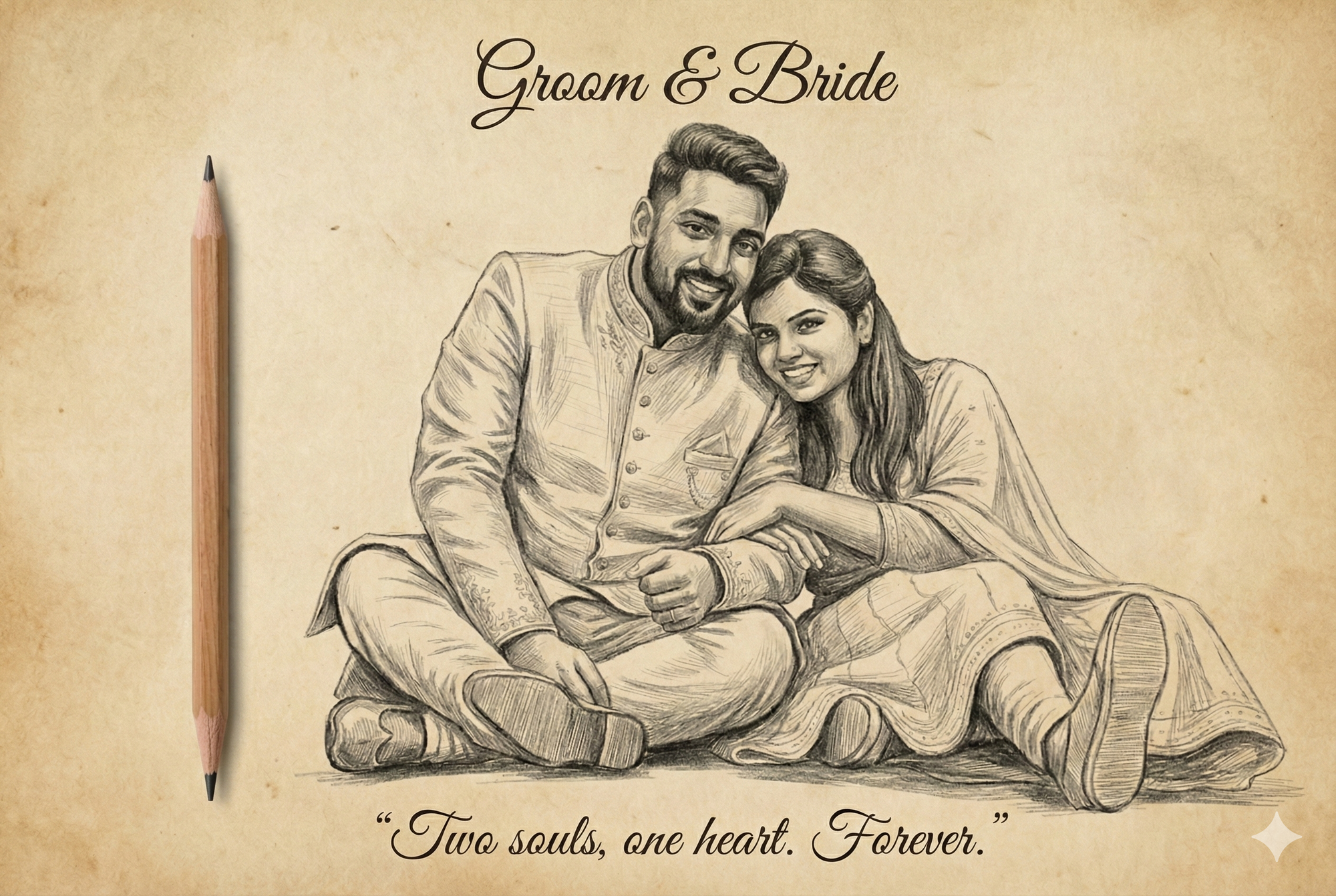 9. Photorealistic pencil portrait sketch of couple embracing, faces matching exactly. Text "(male name) & (female name)" above, decorative quote below, pencil upright at left, sepia paper background, ultra-detailed shading.