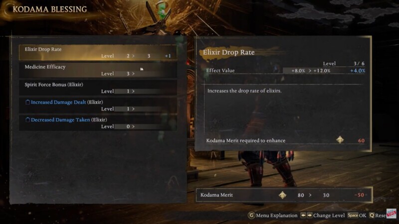 To activate them, pray at a shrine by holding the interact key, enter the Blessing menu, and select Kodama Blessings. Using accumulated Kodama Merit allows you to increase medicine efficiency.