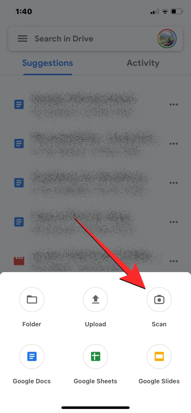 - Inside Google Drive, tap on the + button at the bottom right corner and select Scan.