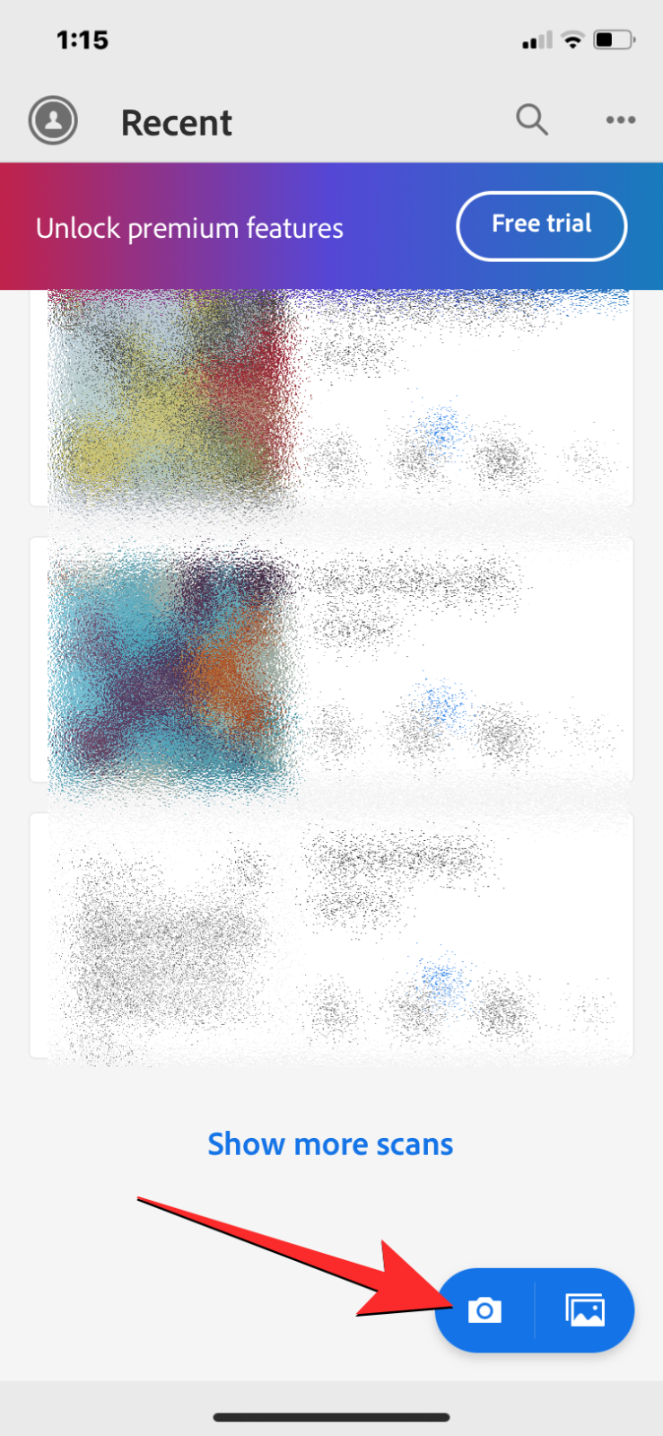- Inside Adobe Scan, tap on the camera icon at the bottom right.
