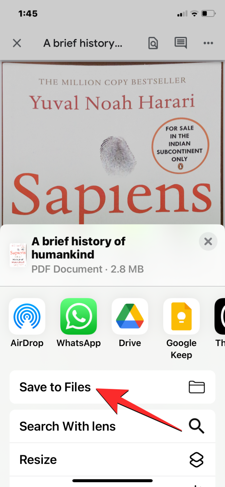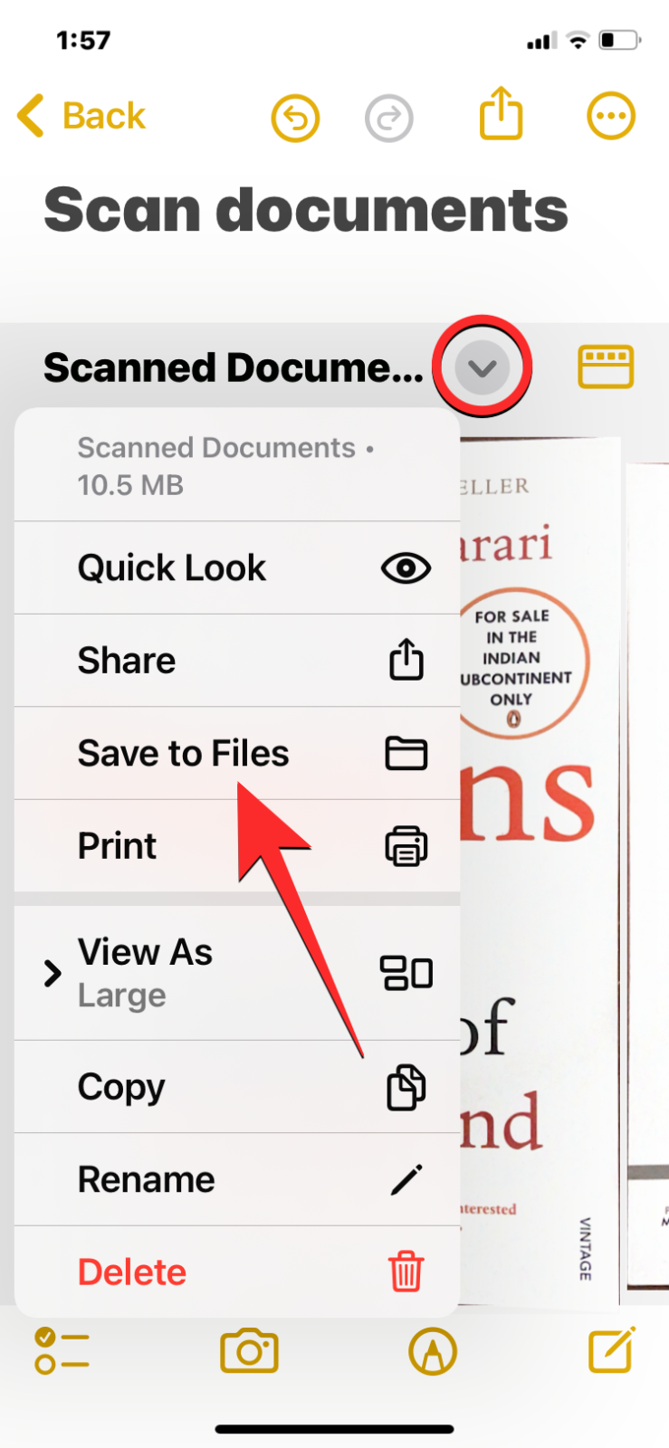 - To save it as a PDF file, tap on the down arrow adjacent to the scanned document’s title and select Save to Files.