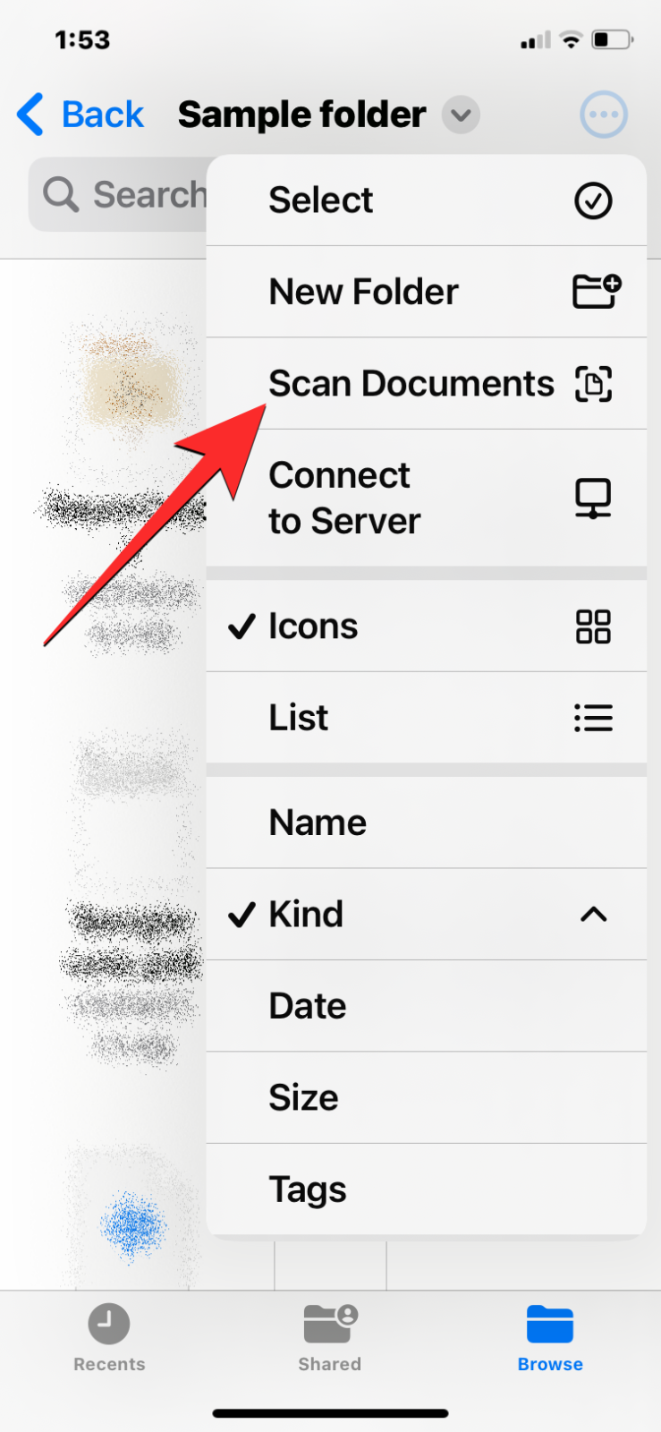 - Inside this folder, tap on the 3-dots icon at the top right corner and select Scan Documents.