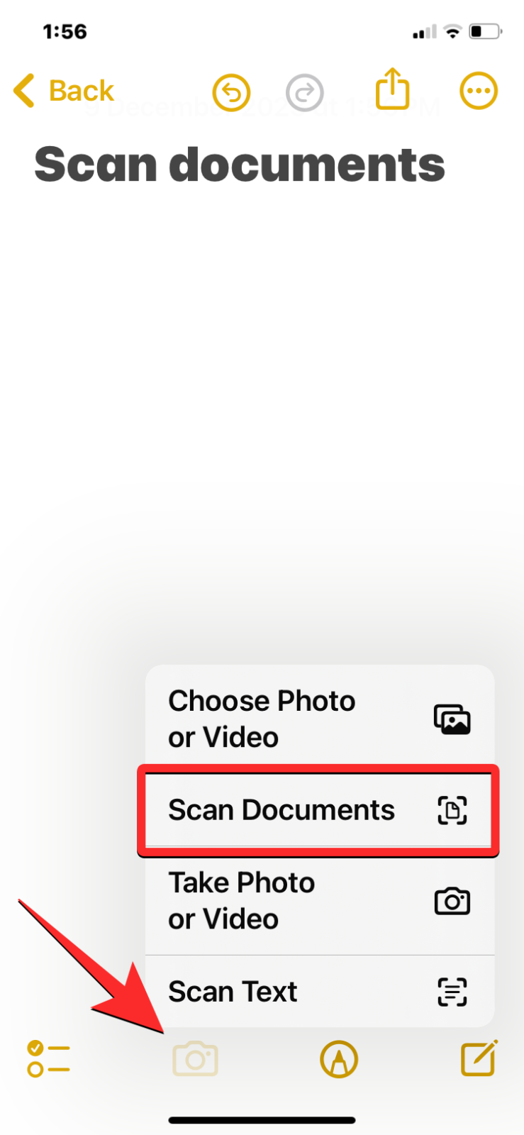 - When the selected note opens, tap on the Camera icon at the bottom and select Scan Documents.