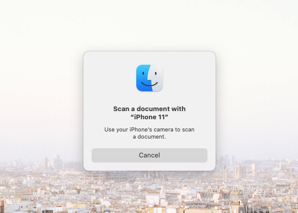 - A dialog box will appear on your Mac with the message “Scan a document with iPhone”.