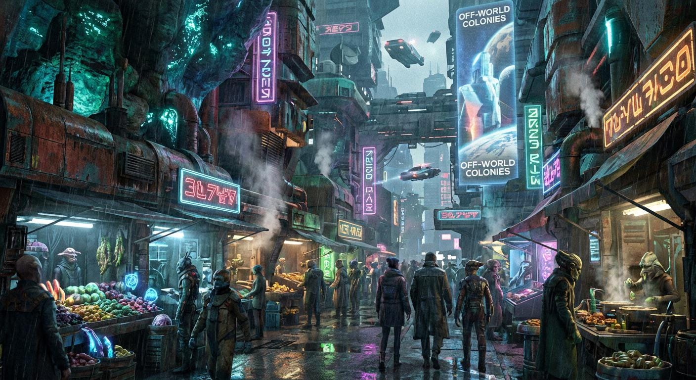 33. A bustling marked on a distant Bladerunner-inspired planet