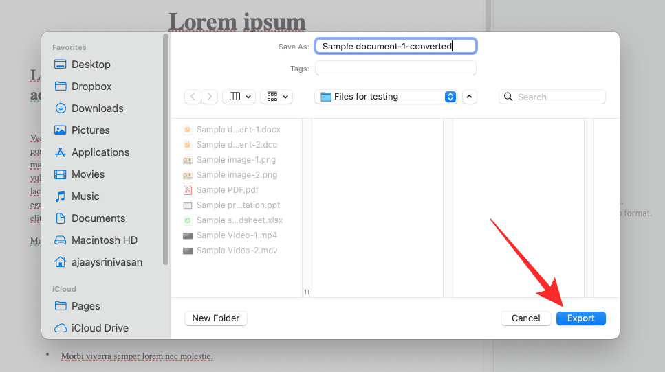 Next, enter the name of the new document file and choose an appropriate location for your new file. Once done, click Export.