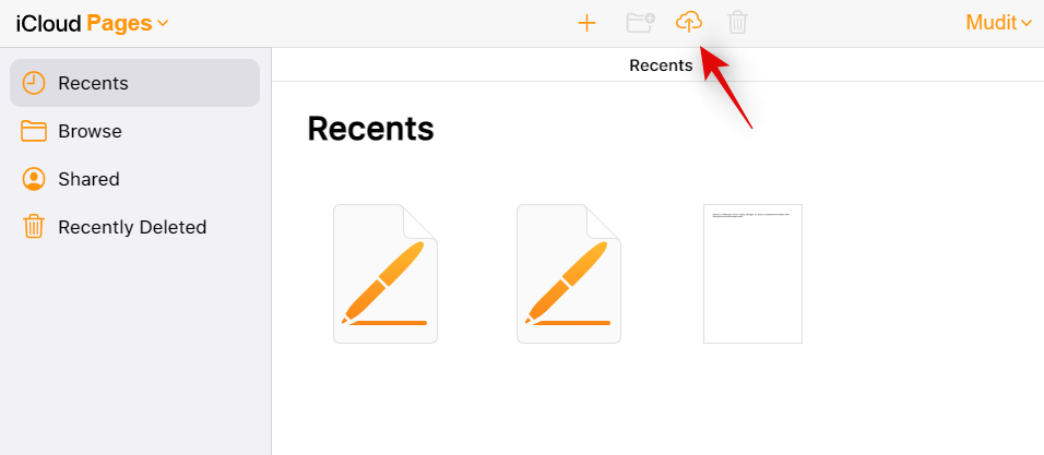 The Pages web app will now open in your browser. Click the Cloud upload icon at the top.