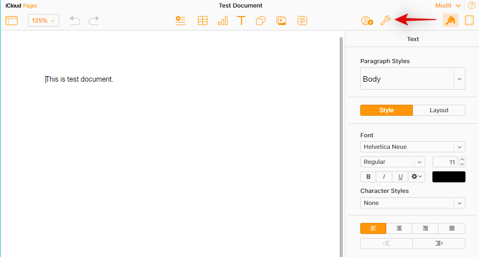 The file will now be opened in the Pages web app. This can take some time depending on your network speed and available bandwidth. Once the file opens, check your document and verify everything is as intended. Now click the Settings icon at the top.