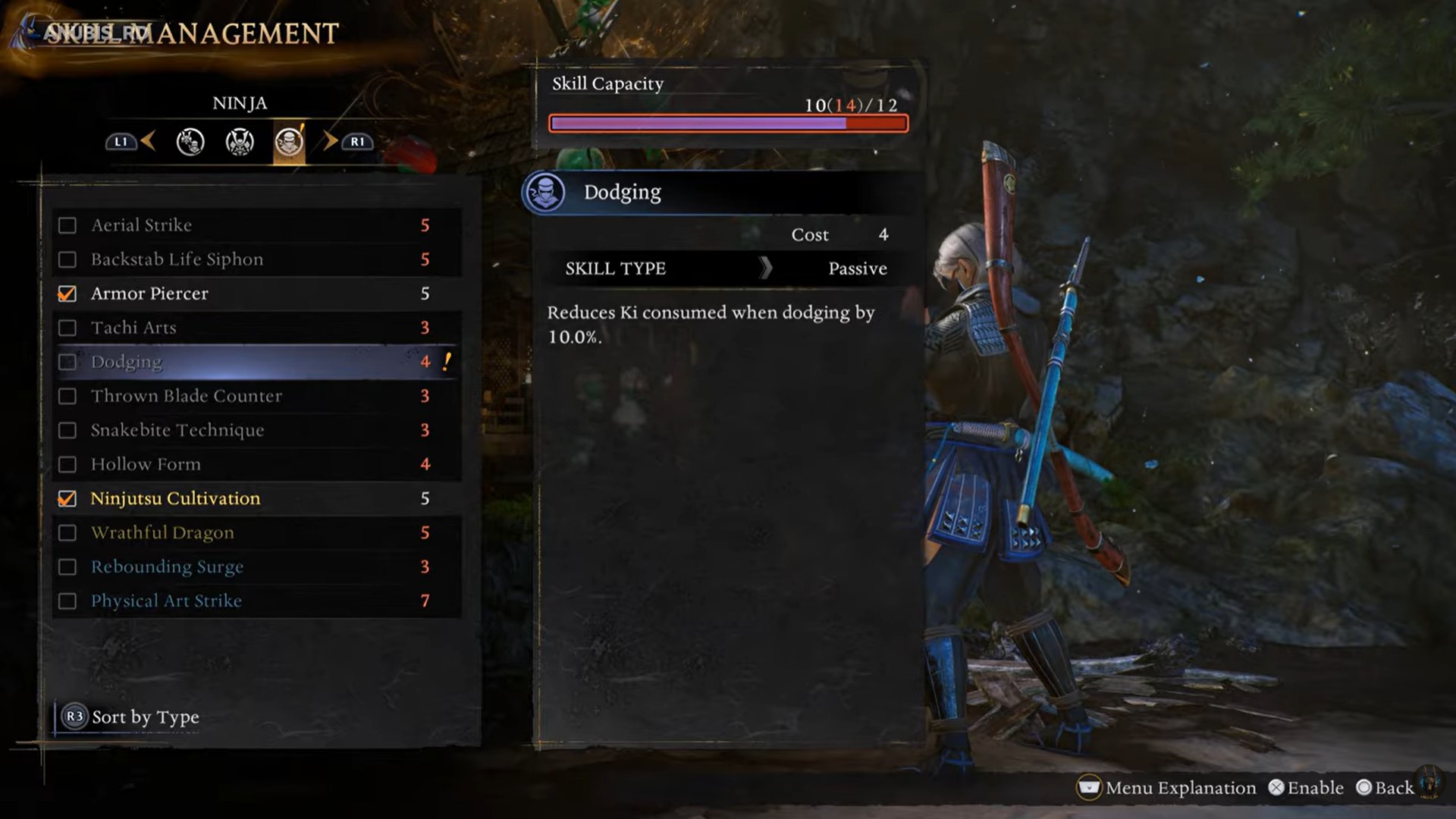 Dodging reduces Ki consumption by 10% whenever you evade. Since ninja builds rely heavily on mobility and quick repositioning, this passive lets you dodge more often without entering Ki exhaustion.