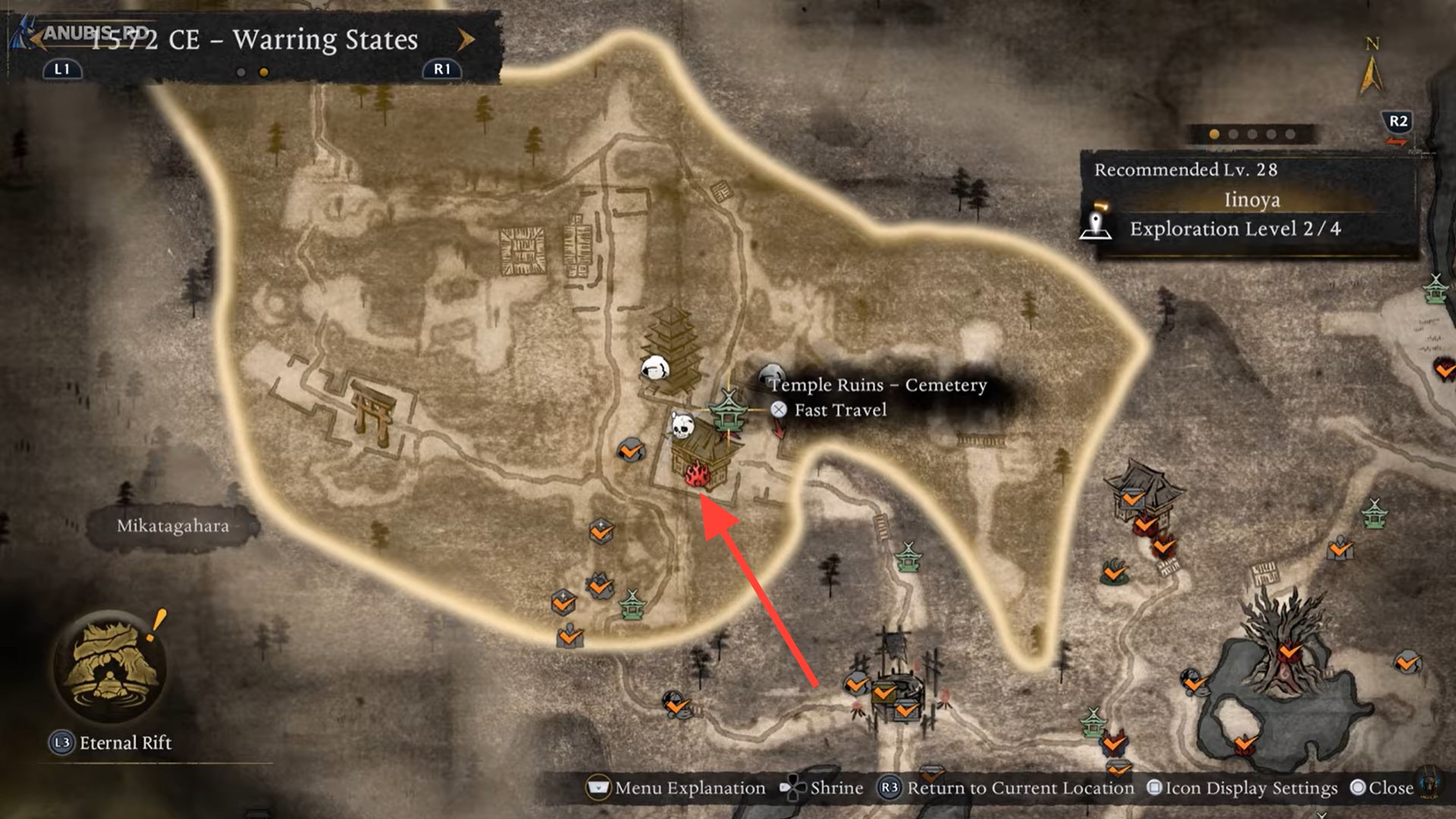 • Travel to the Temple Ruins Cemetery Shrine in the first region.