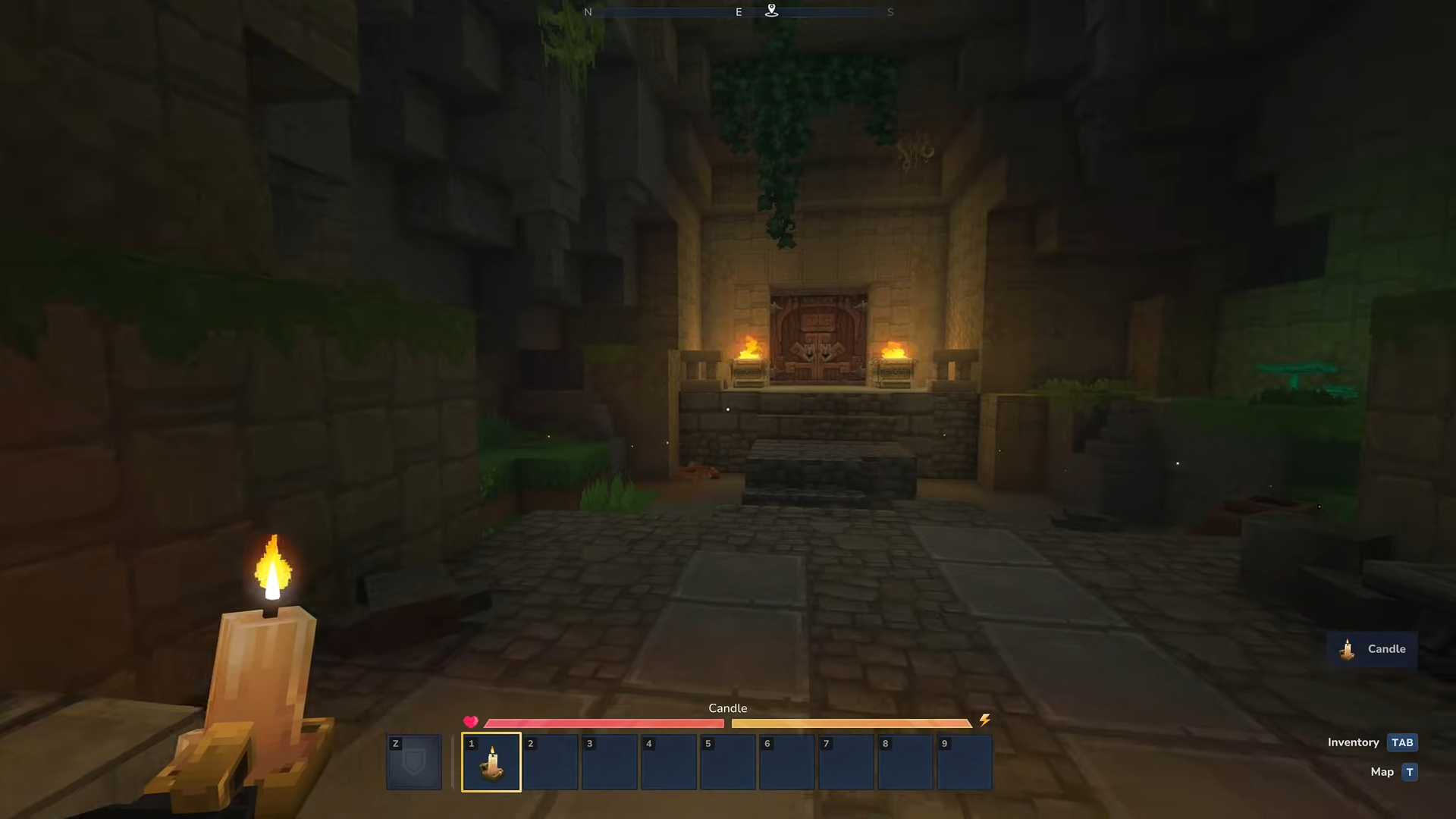 Punch a candle at the starting spawn and place it in your off-hand slot. This provides automatic light in caves without the need for constant torch placement.