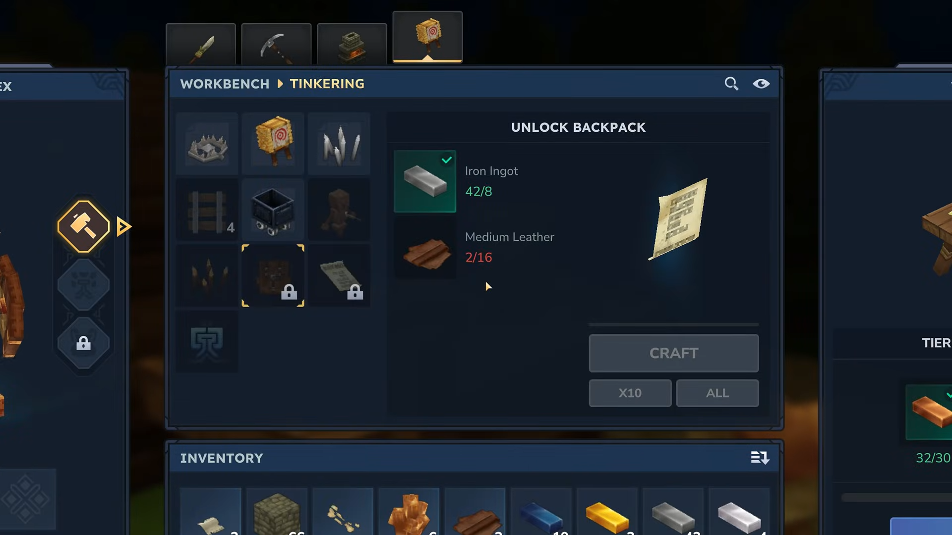 Upgrade your workbench to level 2 and gather 8 iron ingots and 16 medium leather to craft a backpack.