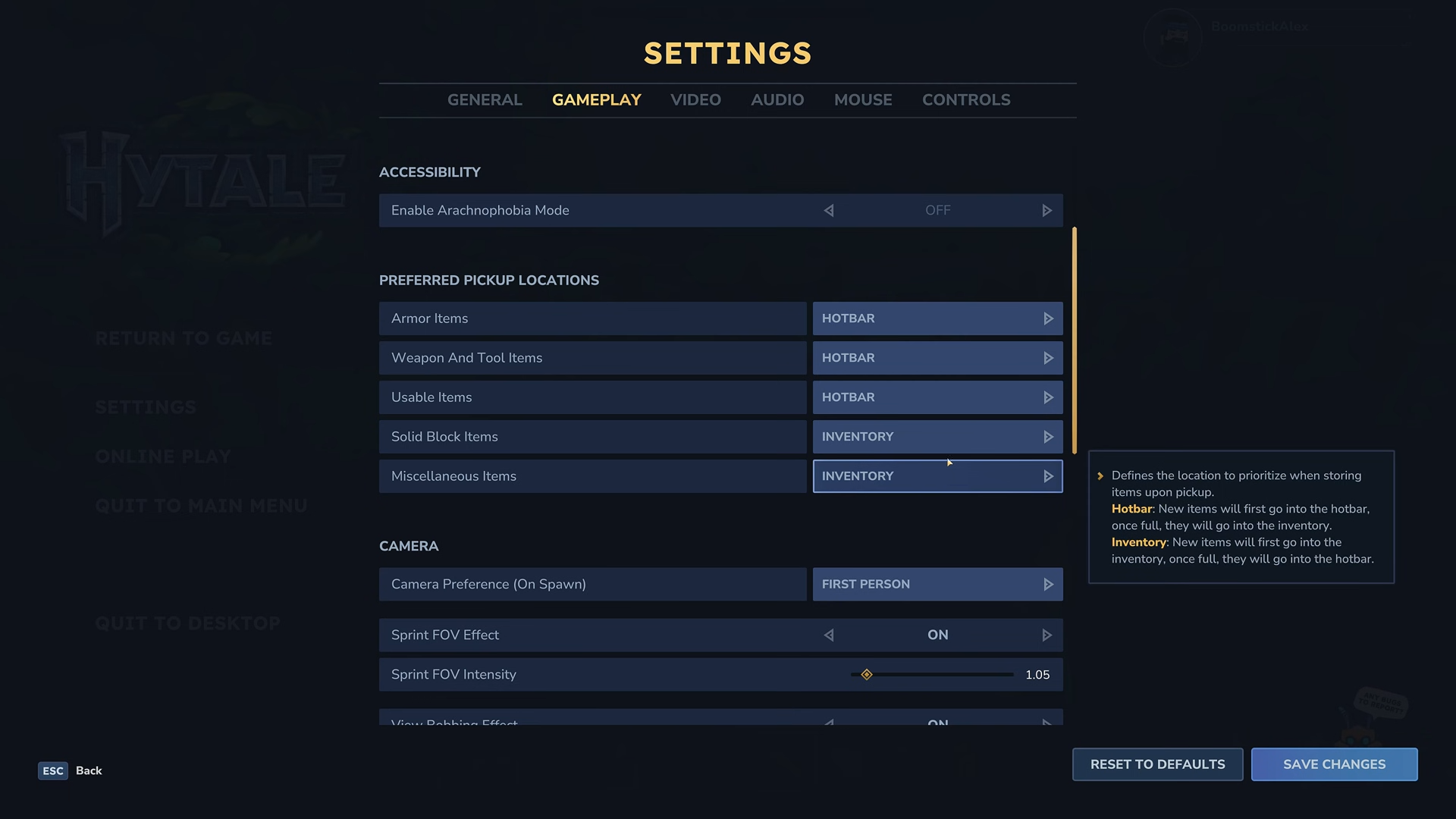 In the "Gameplay" settings, change your "preferred item pickup location" to ensure new items go to your inventory instead of cluttering your hotbar.