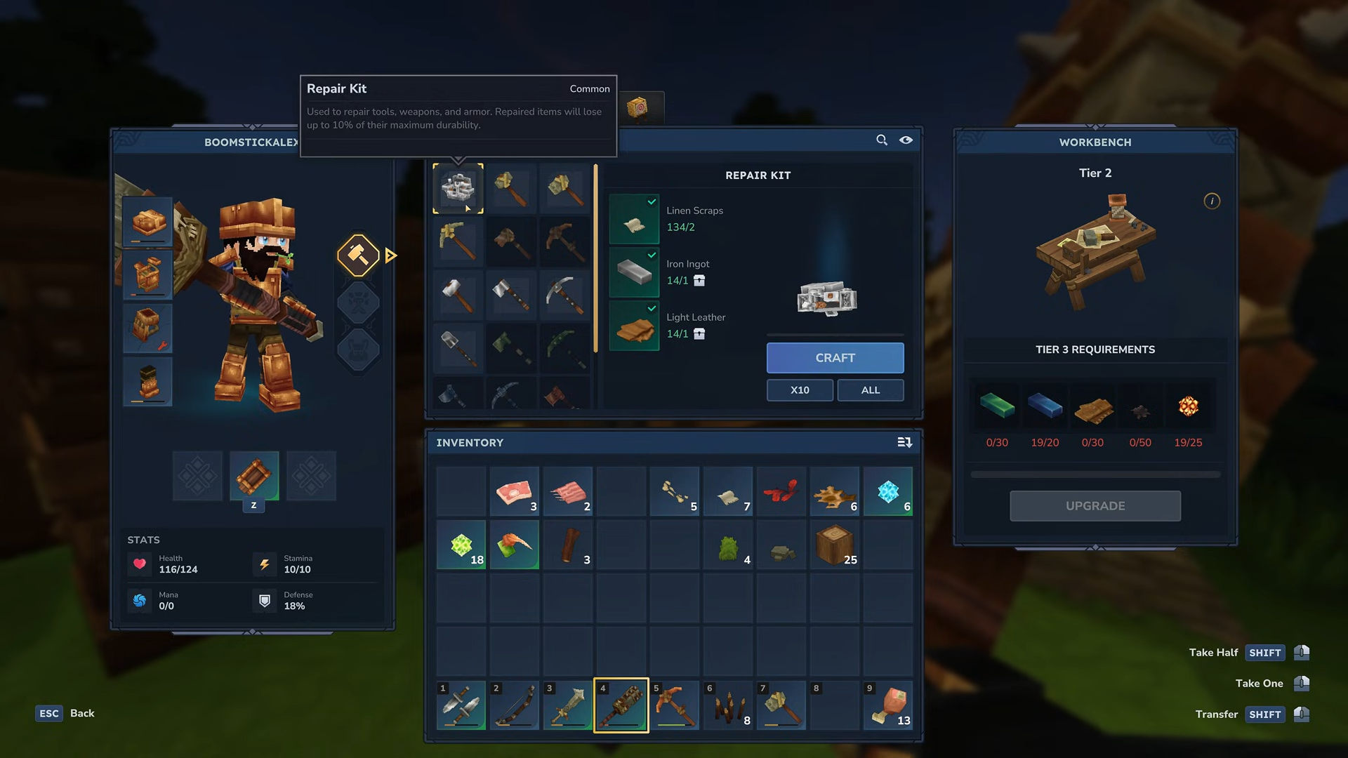 Maintain your gear by crafting repair kits (linen scraps, iron, and light leather) at a workbench to restore the durability of your broken equipment.