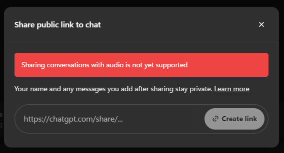 Unfortunately, even though there’s a share icon, sharing conversations with audio is not yet supported.