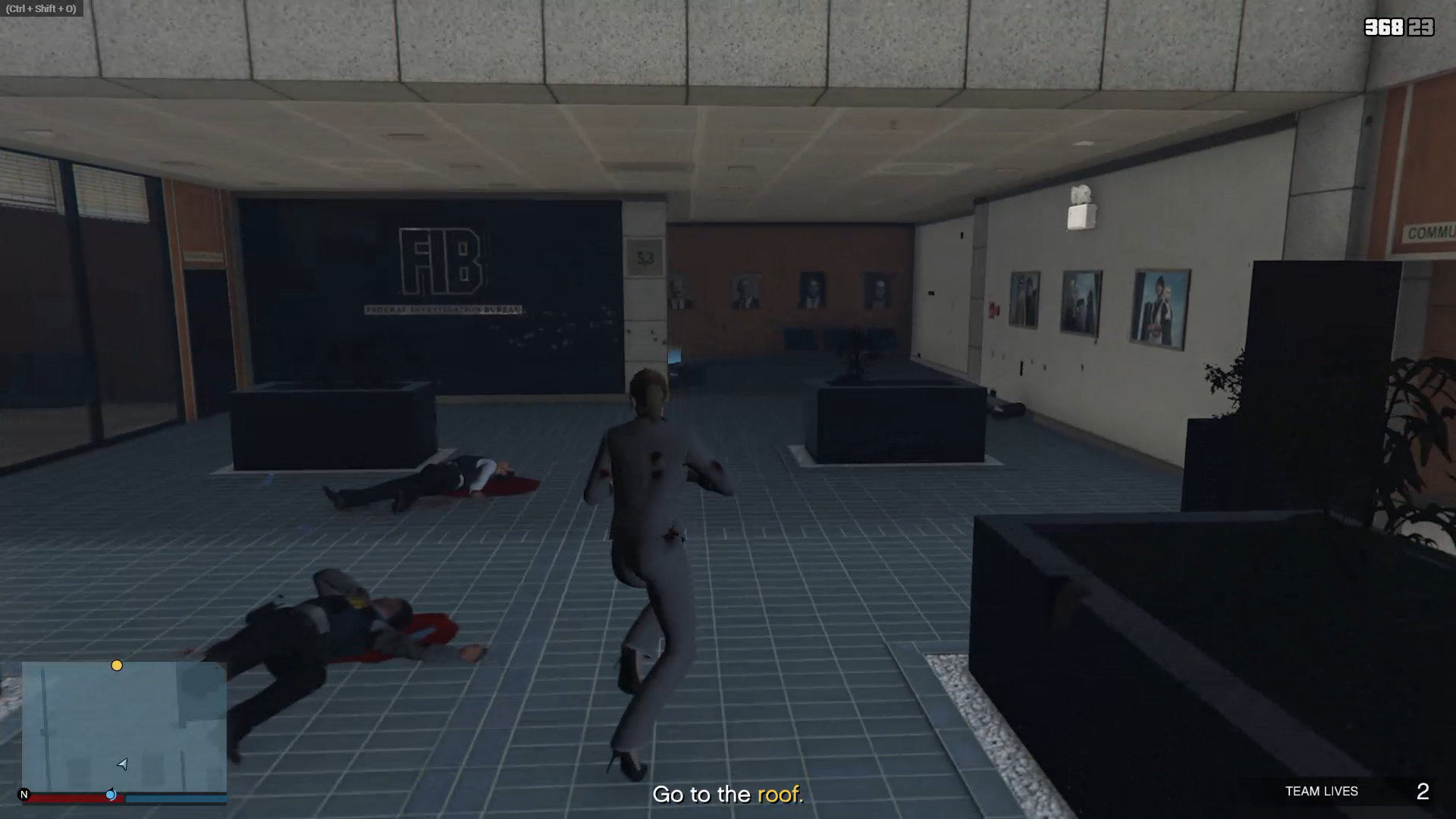 Use the stairs to move to the roof. Knock down all FIB agents who get in the way.