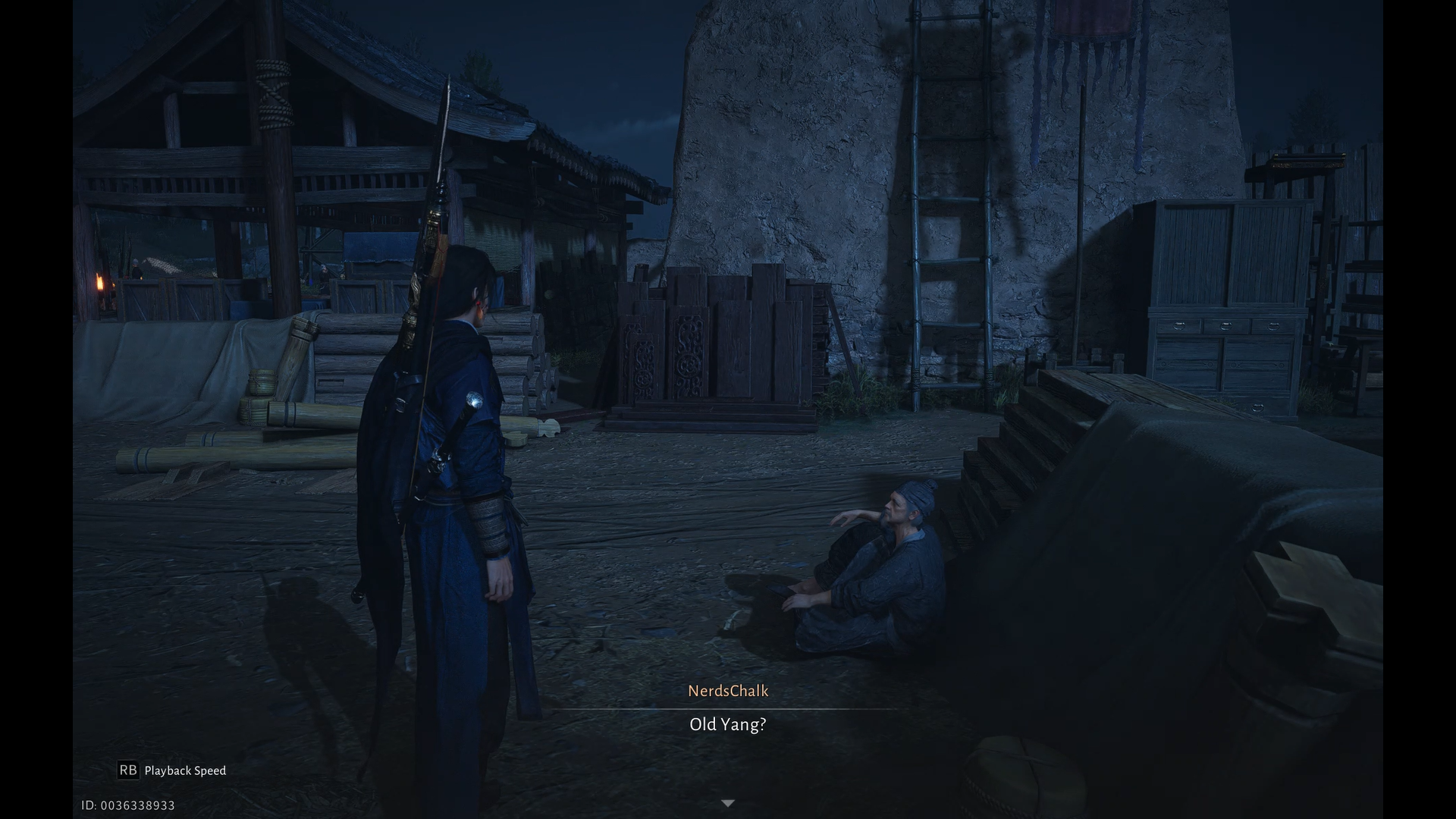 Old Yang is sitting next to wooden logs. interact with him to understand the dog situation.