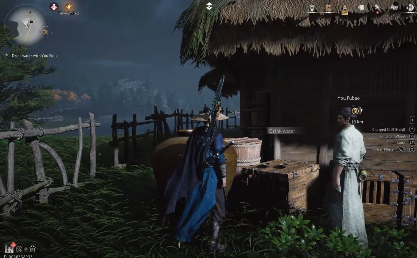 Follow him again, and he will lead you inside Harvestfall Village near a house. Drink water with him.
