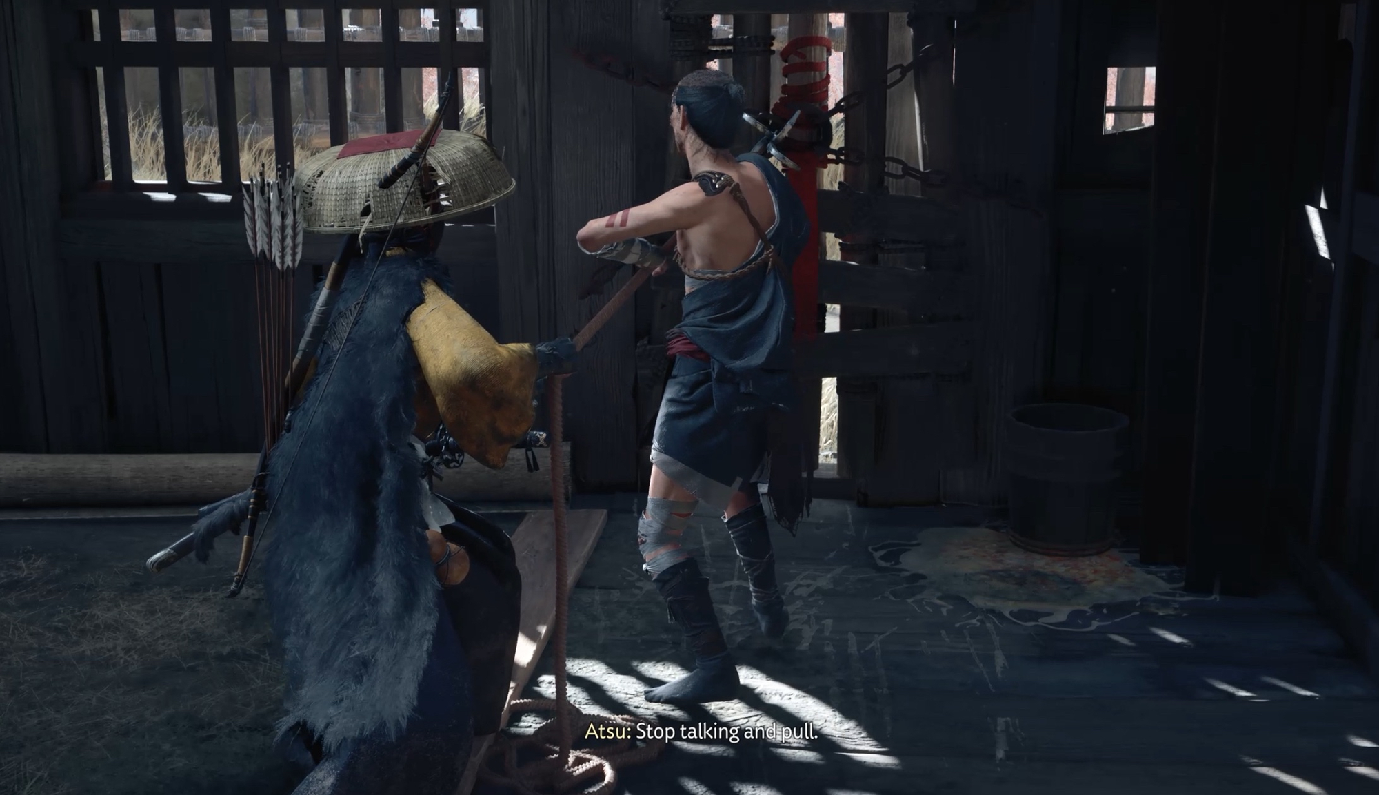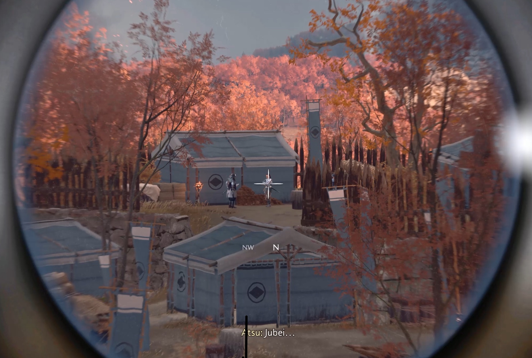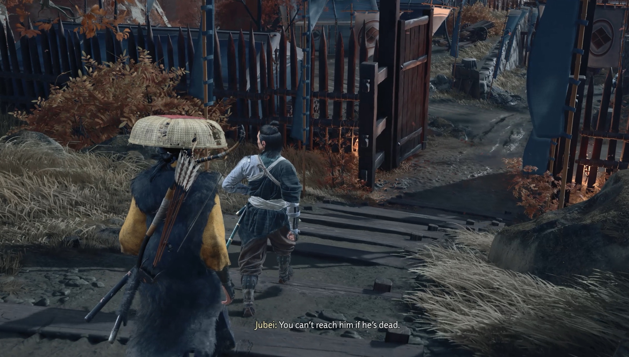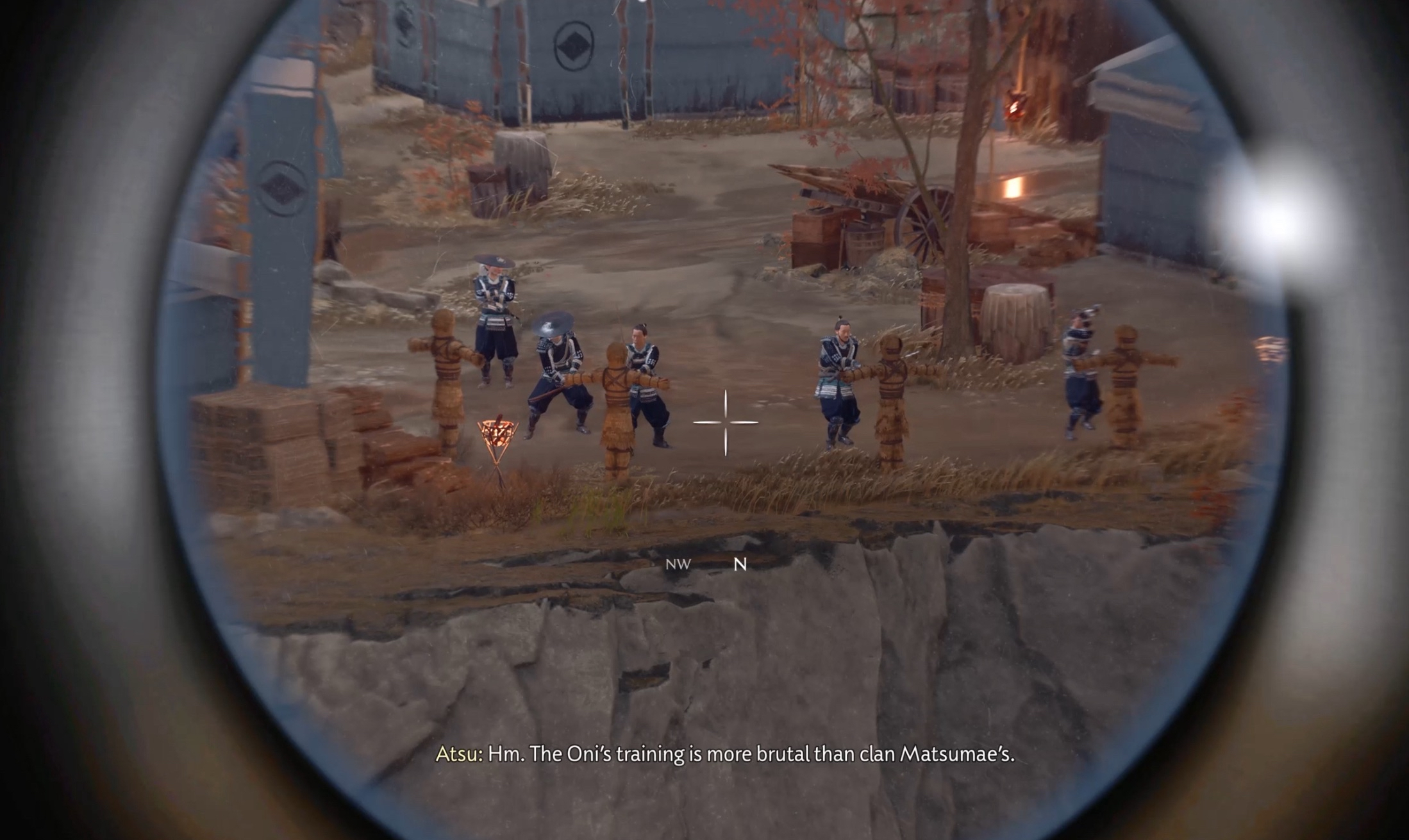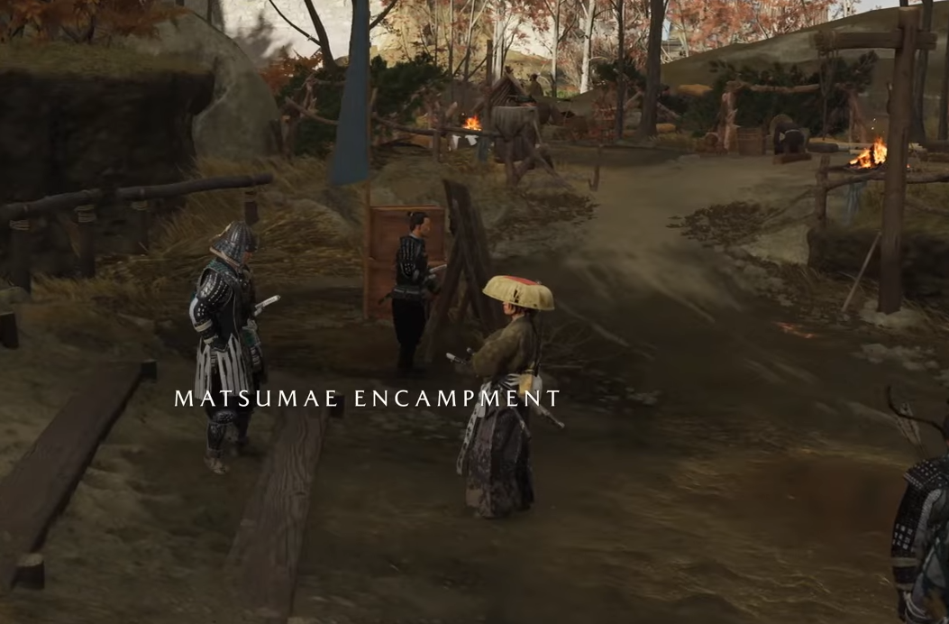 Approach the gate, a cut scene triggers in which the guard refuses to grant Atsu entry. Your next objective is to find another way into the camp.