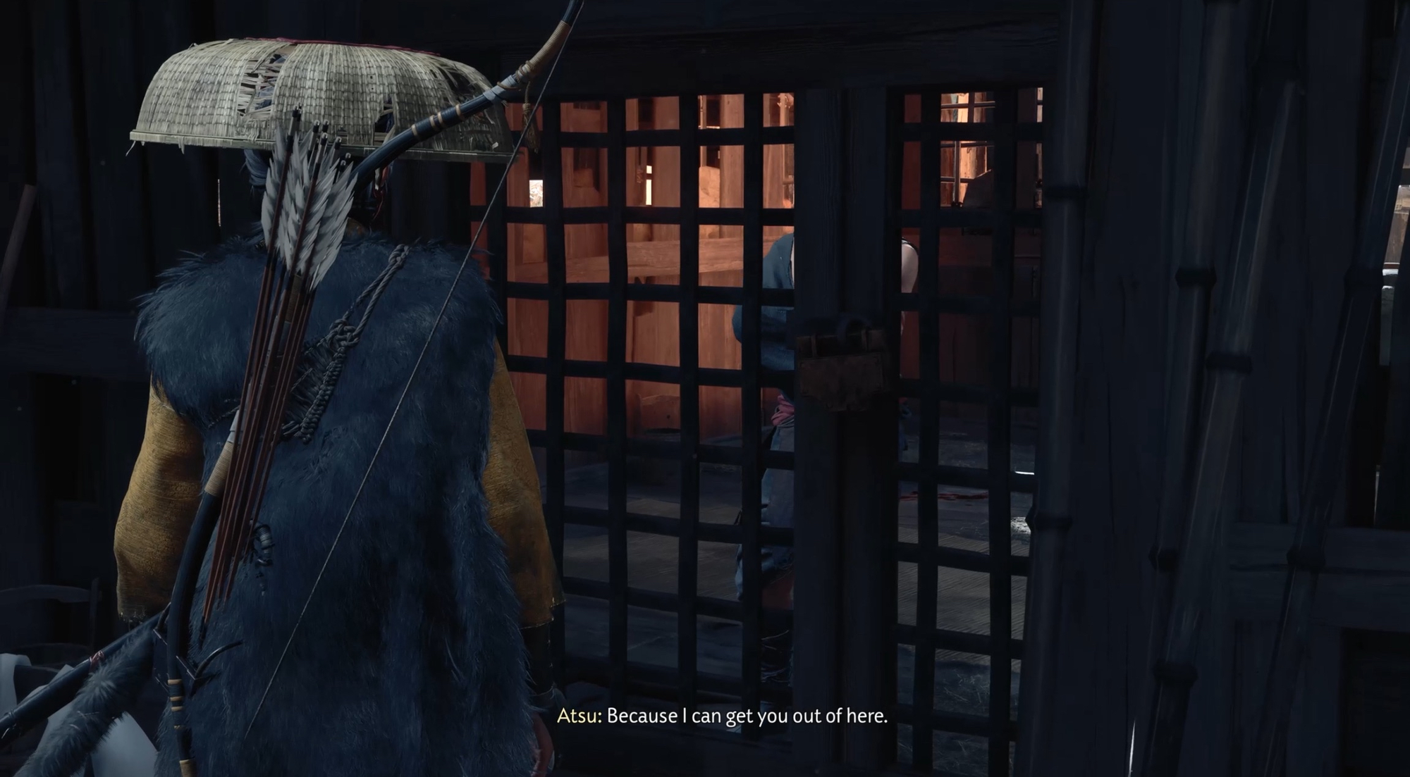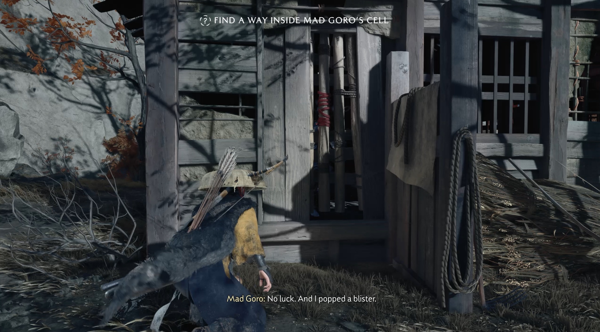 Look around the prison for weak points. You spot the bamboos outside and suggest Goro to break it which he is unable to do.