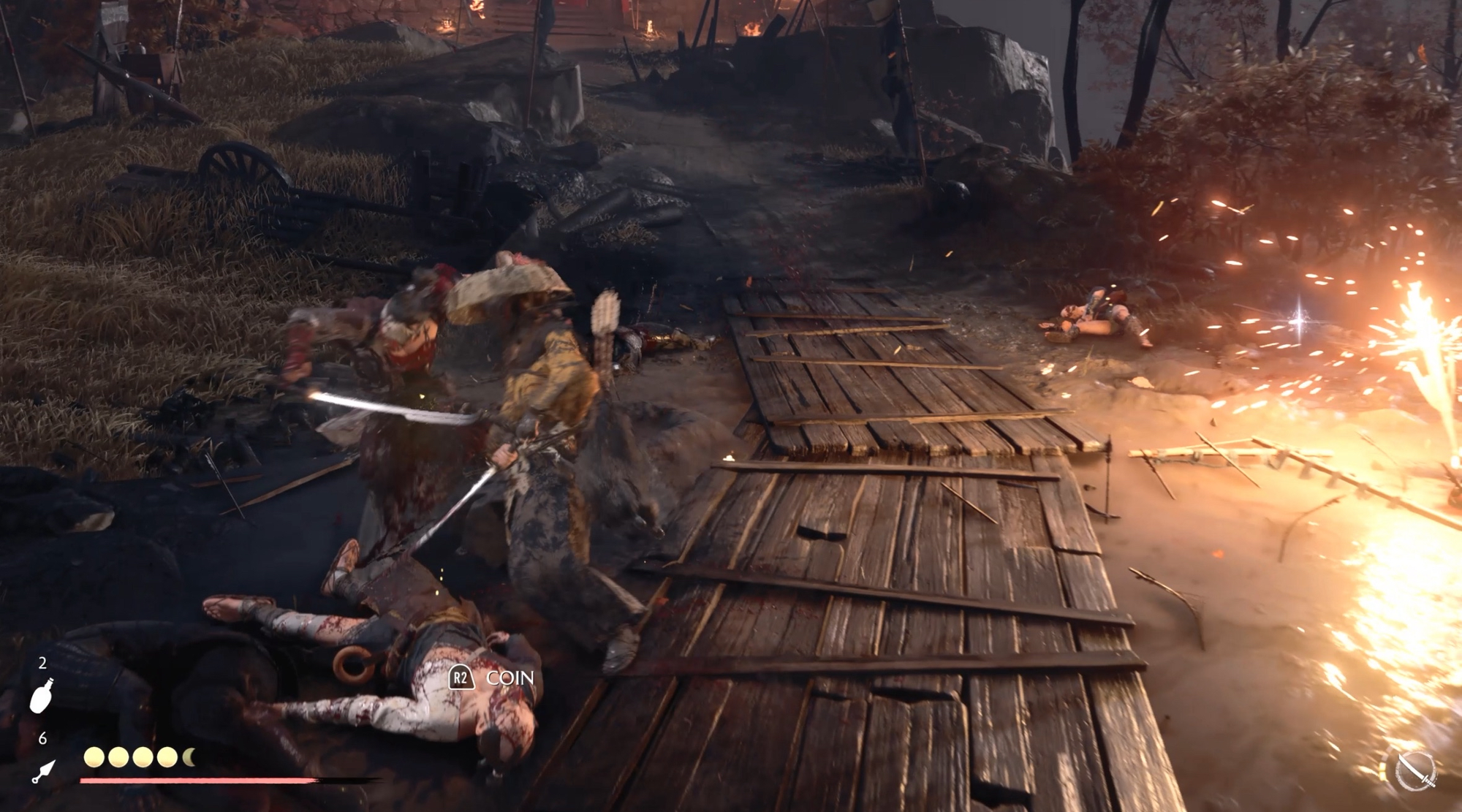 - Be ready to switch stances: The bridge/construction fight requires mobility (for grappling and swinging) + crowd-control for the Oni with spears/kanabo.