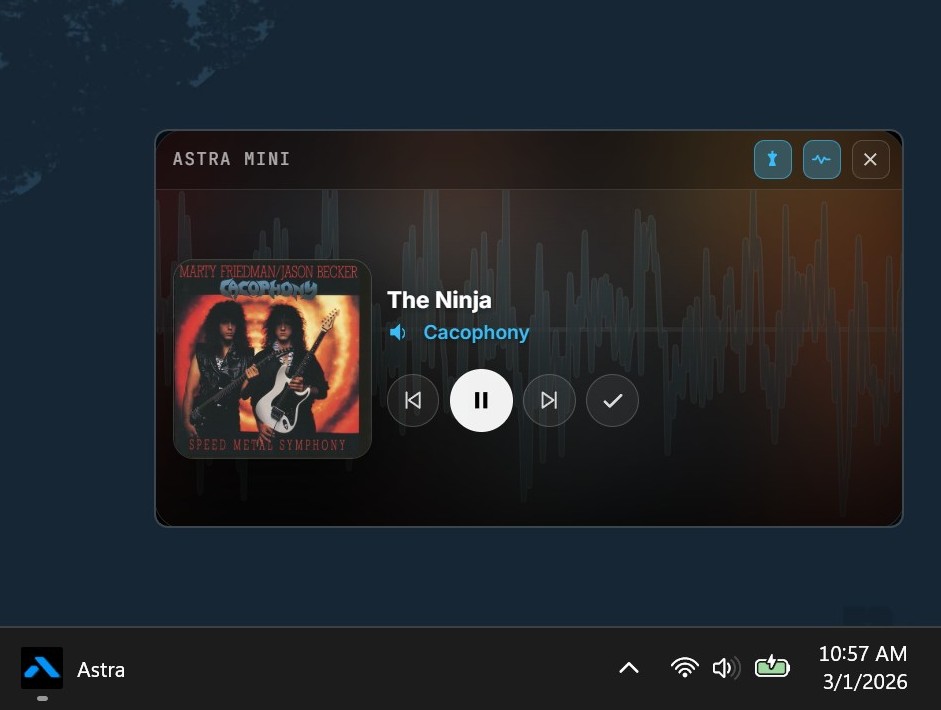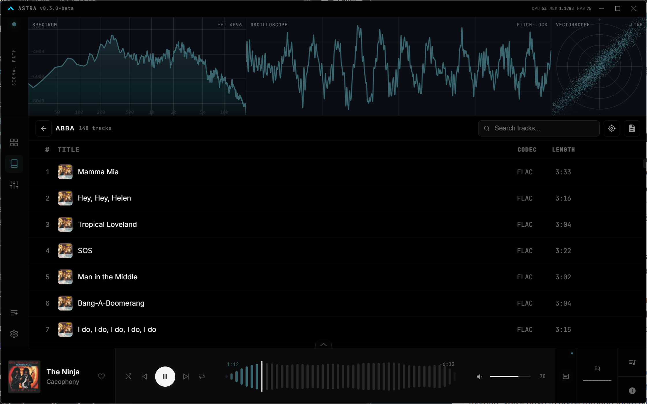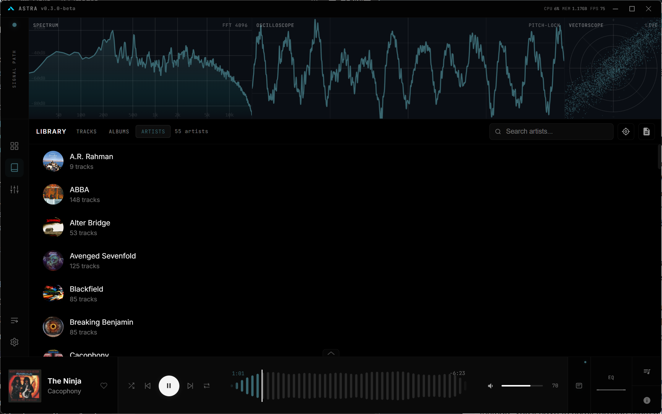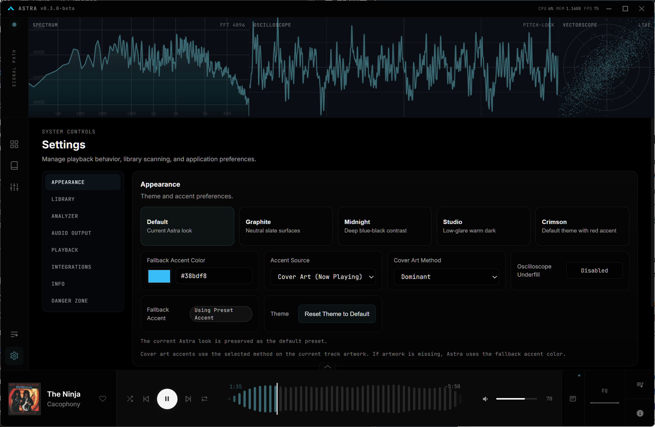 There are several things going for Astra. It has Spectrum, Oscilloscope, and Vectorscope panels at the top, an easy to get to equalizer, track info panels, and a clean and modern UI. You can set the accent color to change based on the album art, change channel routing, integrate Discord, and much more.