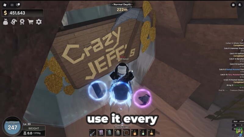 Oxygen refilling becomes more strategic here. Crazy Jeff’s Cave provides a reliable refill spot, allowing you to extend farming sessions without returning to surface-level refill stations. Efficient route planning between fish clusters and refill points is key to maximizing earnings per dive.