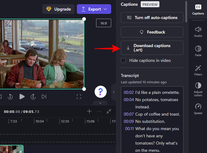 Now, you can also download the automatically generated captions in Clipchamp. To do so, click on Download captions (.srt).